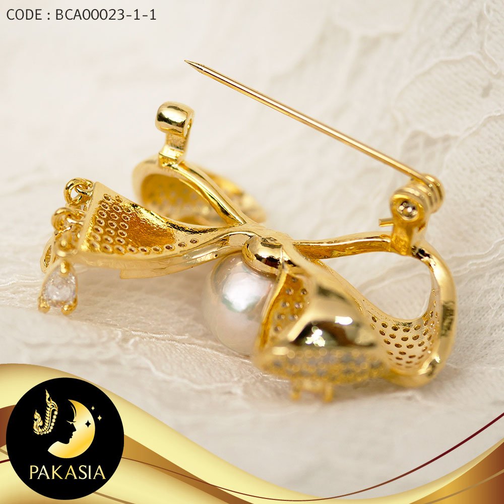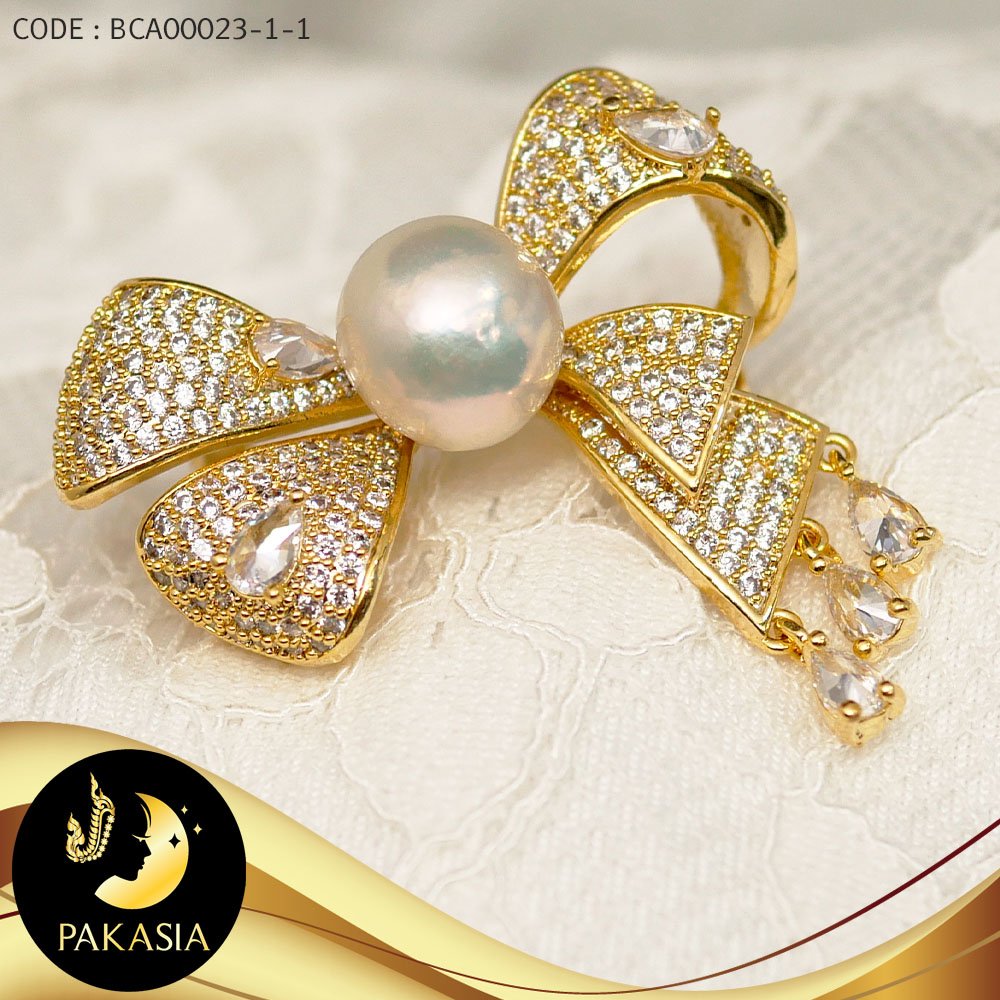 เข็มกลัดมุกโบว์ใหญ่ประดับเพชร CZ มุกน้ำจืด สีขาว ทรงบาร็อค ขนาด 9.5-10 mm เกรด AA+ มุกมีรอยธรรมชาติ ±5% ตัวเรือน Alloy ชุบทอง เม็ดมุกแต่ละเม็ดมีลักษณะเฉพาะตัว อาจมีรูปทรง ขนาด และสีต่างกันเล็กน้อย จากภาพโฆษณา สินค้าทุกชิ้นมีใบรับประกันมุกแท้ (Certificate of Guarantee)