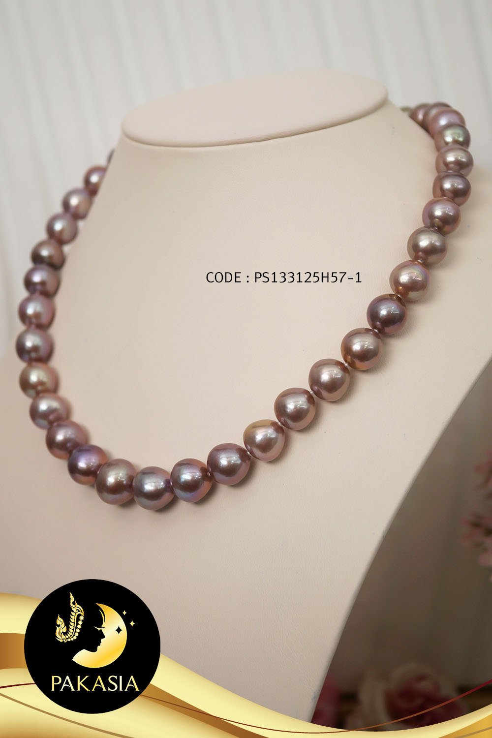 สร้อยคอมุกล้วน มุก Edison คัดเกรด สีม่วงเข้ม ทรงกลม ขนาด 10.5 -12.5 เกรด AA+ ตะขอใบโกศล ประดับเพชร CZ เม็ดมุกมีรอยธรรมชาติ±5% สินค้าทุกชิ้นมีใบรับประกันมุกแท้ (Certificate of Guarantee) เม็ดมุกแต่ละเม็ดมีลักษณะเฉพาะตัว อาจมีรูปทรง ขนาด และสีต่างกันเล็กน้อย จากภาพโฆษณา