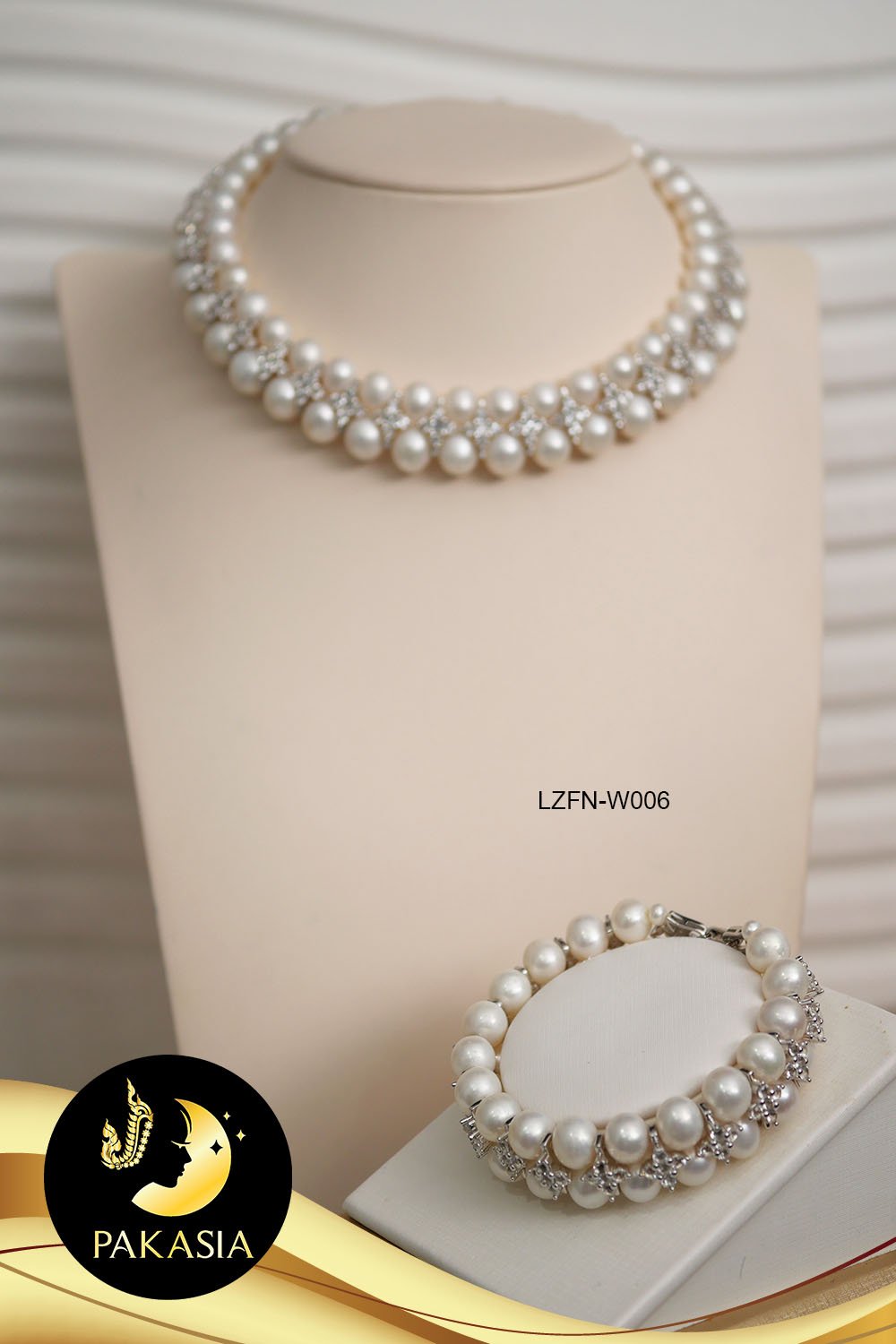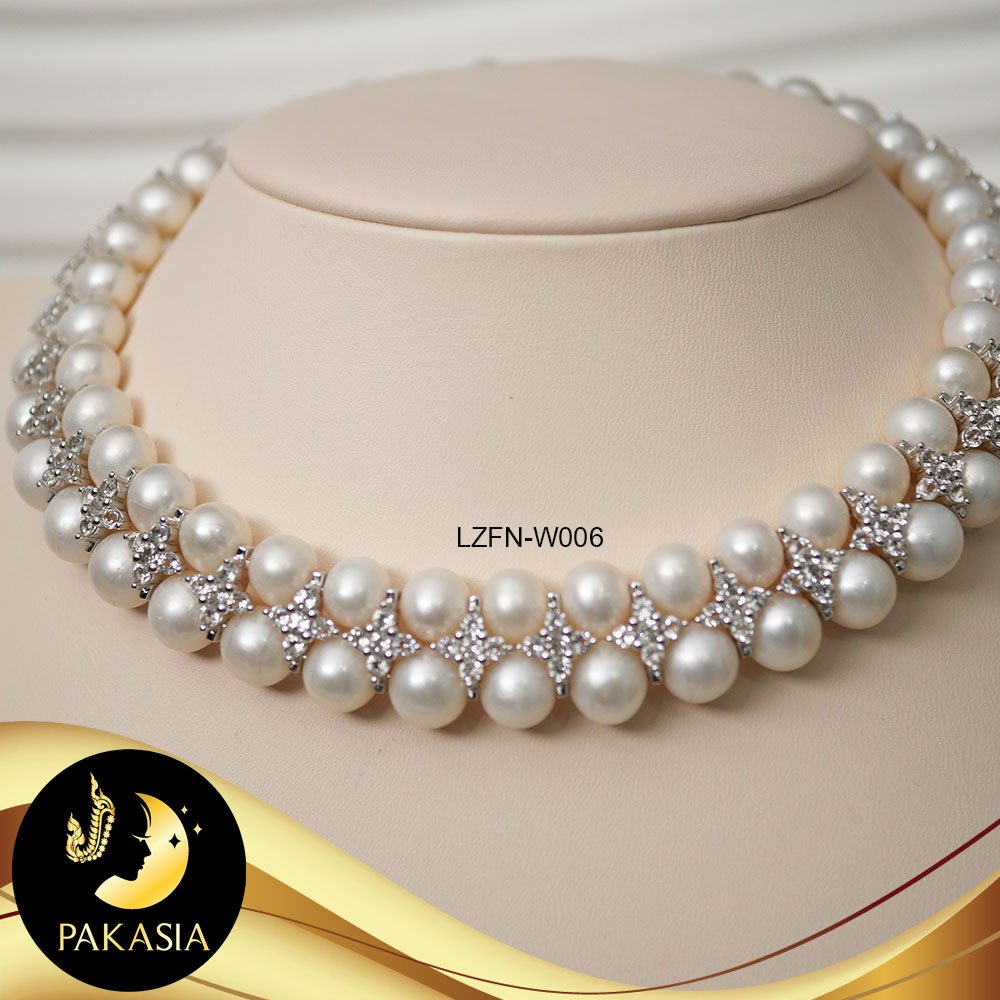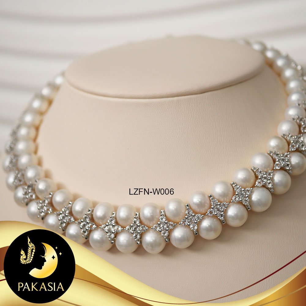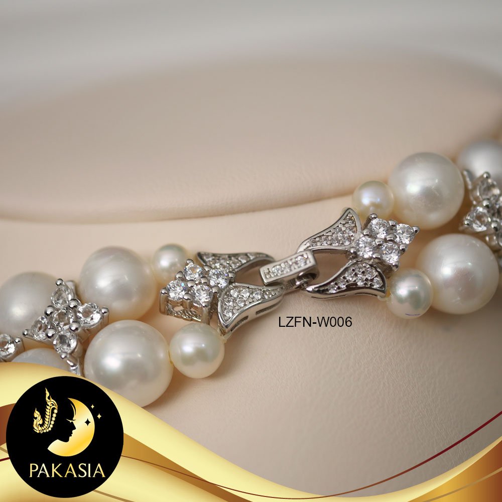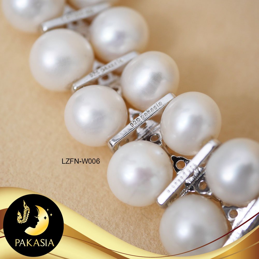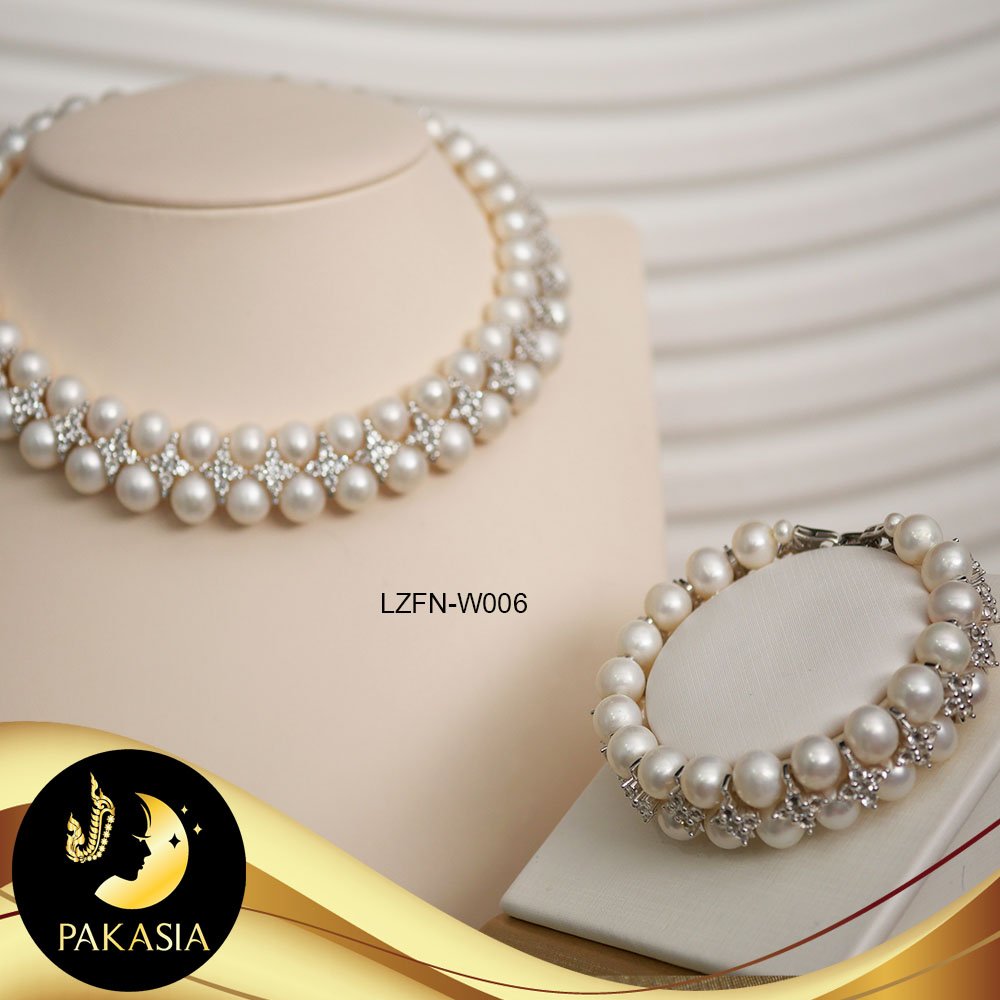 มุกจัดชุด สร้อยคอและสร้อยข้อมือ มุกสีขาว 2 สาย ทรงกลม ขนาด 8-9 mm เกรด AA+ คั่น2สาย ลายดอกไม้ประดับเพชร CZ ตะขอใบโกศลเล็กประดับเพชร CZ เงินแท้ชุบทองคำขาว ความยาวสร้อยคอประมาณ 15-16" ความยาวสร้อยข้อมือประมาณ 7.2" มุกมีรอยธรรมชาติ±3% สินค้าทุกชิ้นมีใบรับประกันมุกแท้ (Certificate of Guarantee) เม็ดมุกแต่ละเม็ดมีลักษณะเฉพาะตัว อาจมีรูปทรง ขนาด และสีต่างกันเล็กน้อย จากภาพโฆษณา