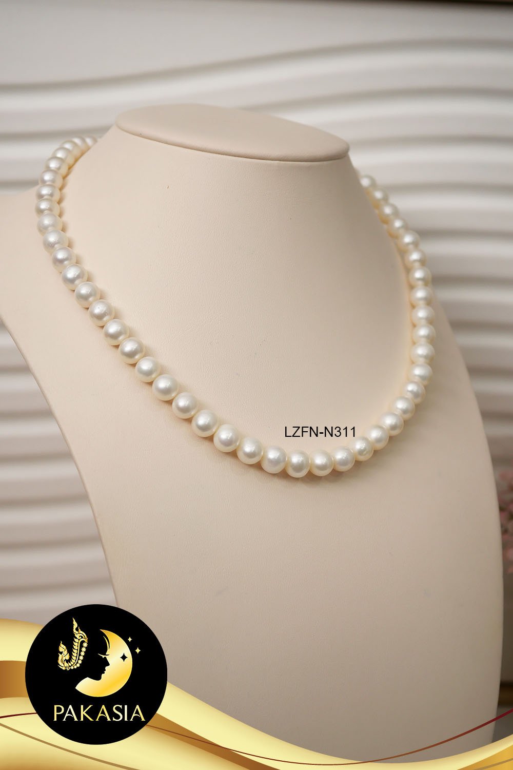 สร้อยคอมุกล้วน มุกน้ำจืดคัดเกรด สีขาว ทรงกลม ขนาด 8-8.5 mm เกรด AA ตะขอเสียบ เงินแท้ 92.5 ชุบทองคำขาว ความยาวประมาณ 18" มุกมีรอยธรรมชาติ สินค้าทุกชิ้นมีใบรับประกันมุกแท้ (Certificate of Guarantee) เม็ดมุกแต่ละเม็ดมีลักษณะเฉพาะตัว อาจมีรูปทรง ขนาด และสีต่างกันเล็กน้อย จากภาพโฆษณา