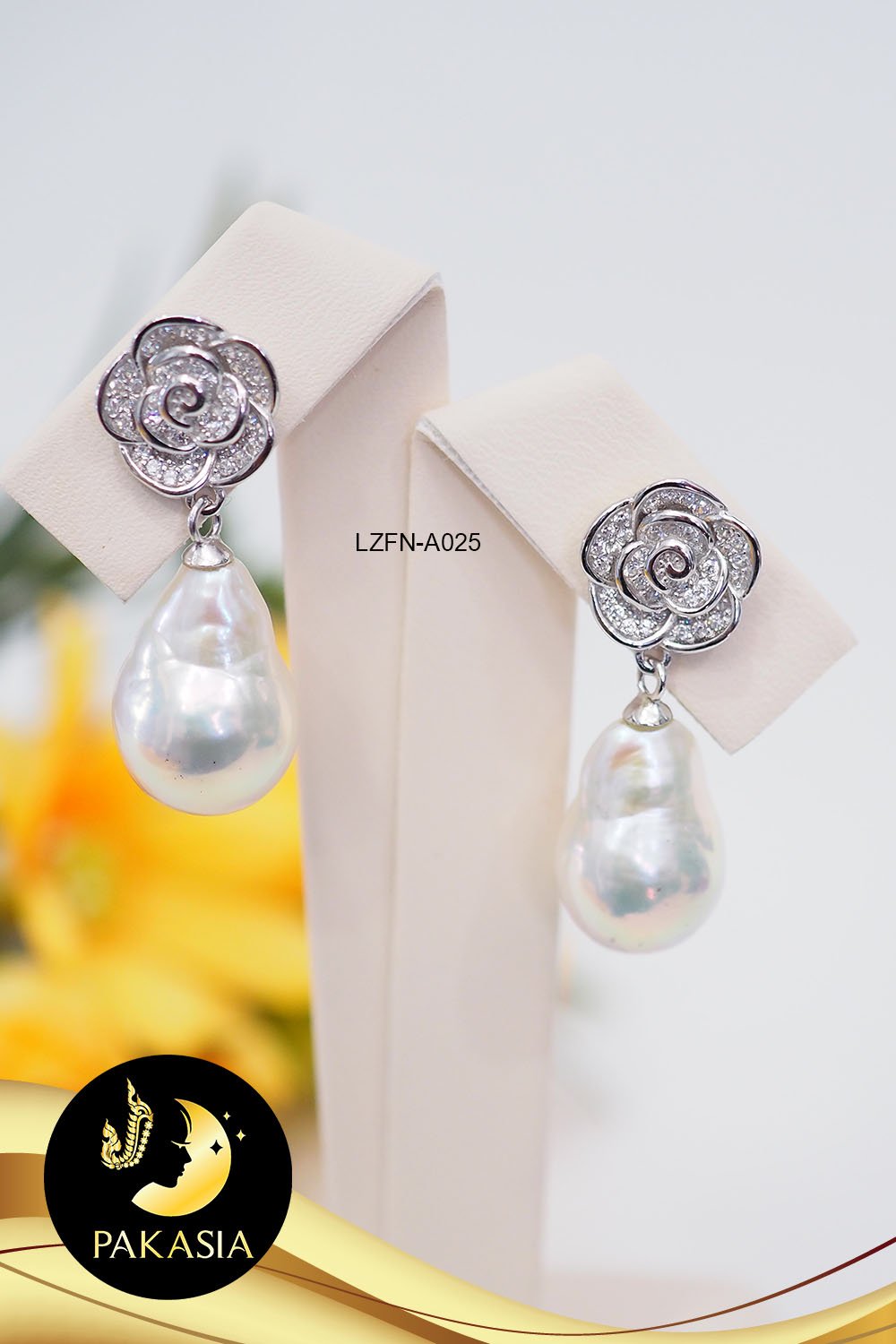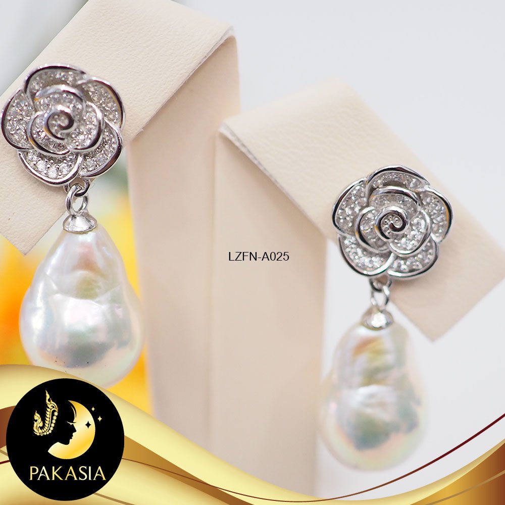 ต่างหูมุกดอกกุหลาบ ห้อยมุกน้ำจืดคัดเกรด สีขาว ทรงบาร็อค มุกขนาด 11 mm เกรด AA+ ตัวเรือน เงินแท้ 92.5 ชุบทองคำขาว ประดับเพชร CZ สินค้าทุกชิ้นมีใบรับประกันมุกแท้ (Certificate of Guarantee) เม็ดมุกแต่ละเม็ดมีลักษณะเฉพาะตัว อาจมีรูปทรง ขนาด และสีต่างกันเล็กน้อย จากภาพโฆษณา