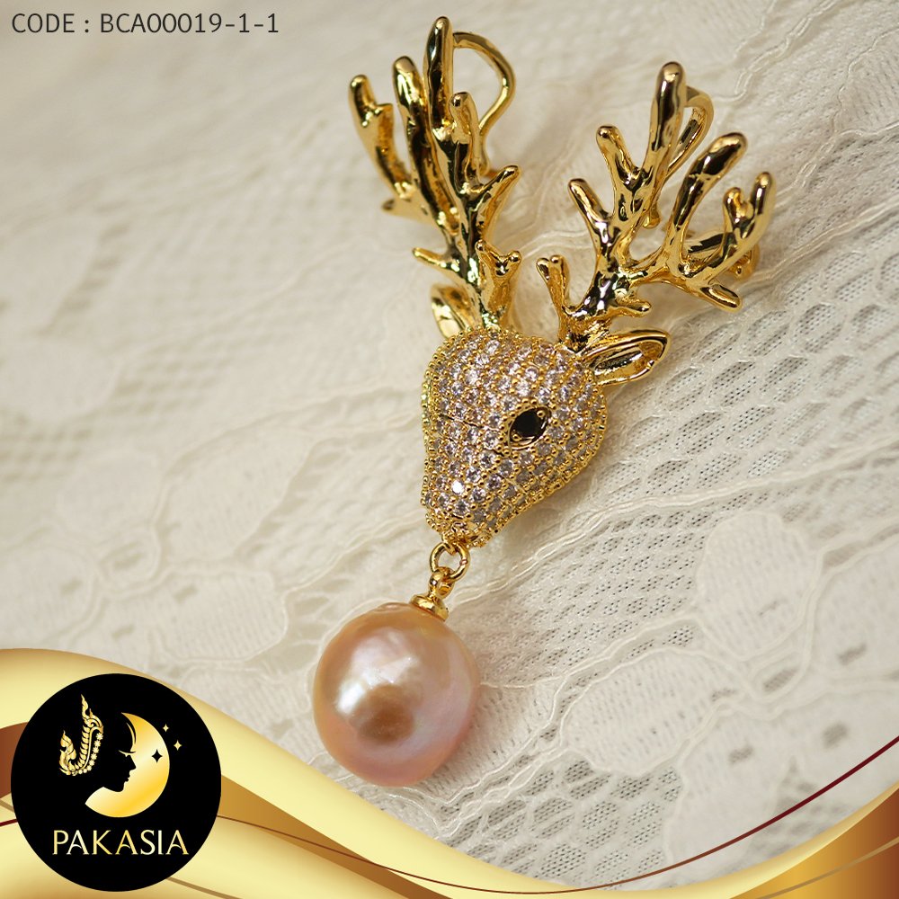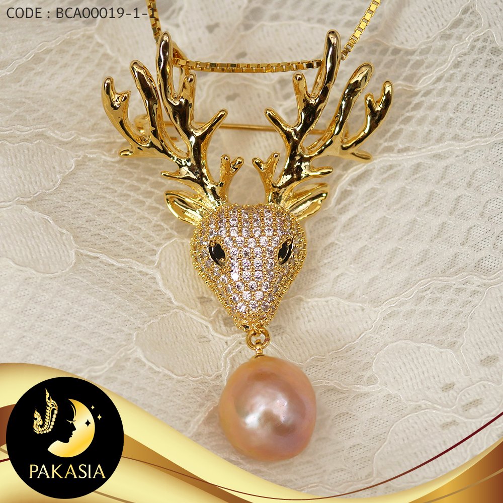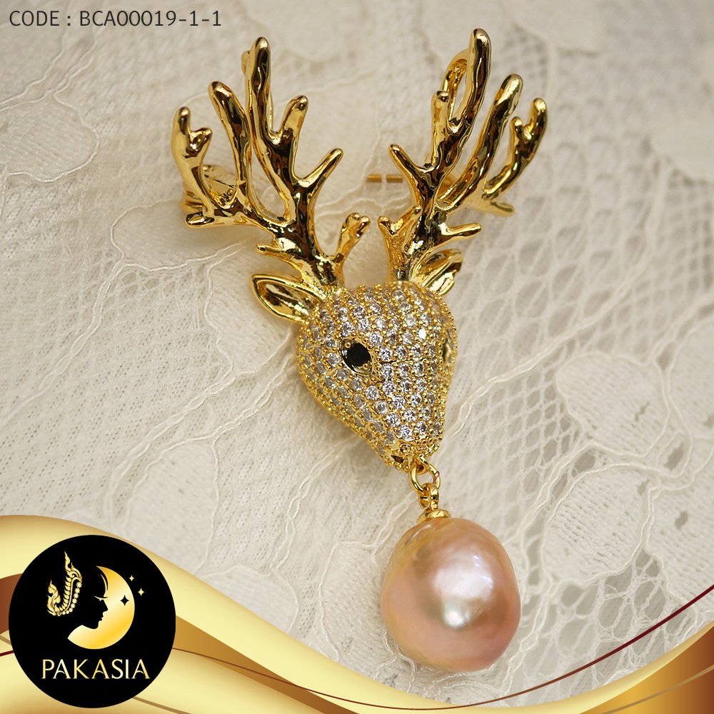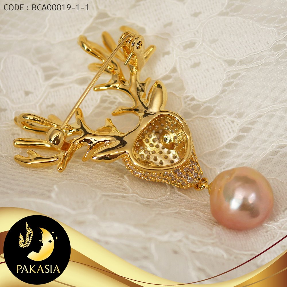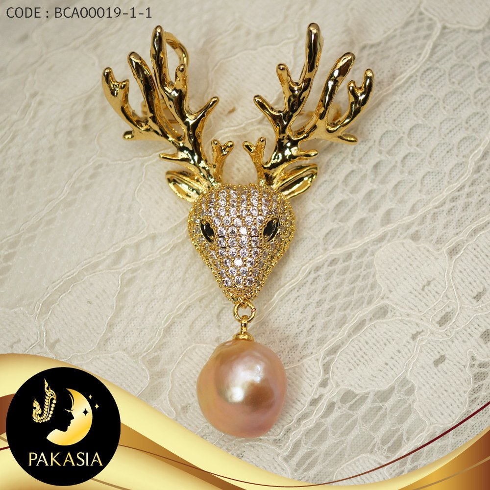 เข็มกลัดมุกกวางรูดอล์ฟ มุกน้ำจืดคัดเกรด สีพีชโอลด์โรส ทรงบาร็อค ขนาด 11-12 mm เกรด AA+ ตัวเรือน Alloy ชุบทอง ประดับเพชร CZ เม็ดมุกแต่ละเม็ดมีลักษณะเฉพาะตัว อาจมีรูปทรง ขนาด และสีต่างกันเล็กน้อย จากภาพโฆษณา สินค้าทุกชิ้นมีใบรับประกันมุกแท้ (Certificate of Guarantee)