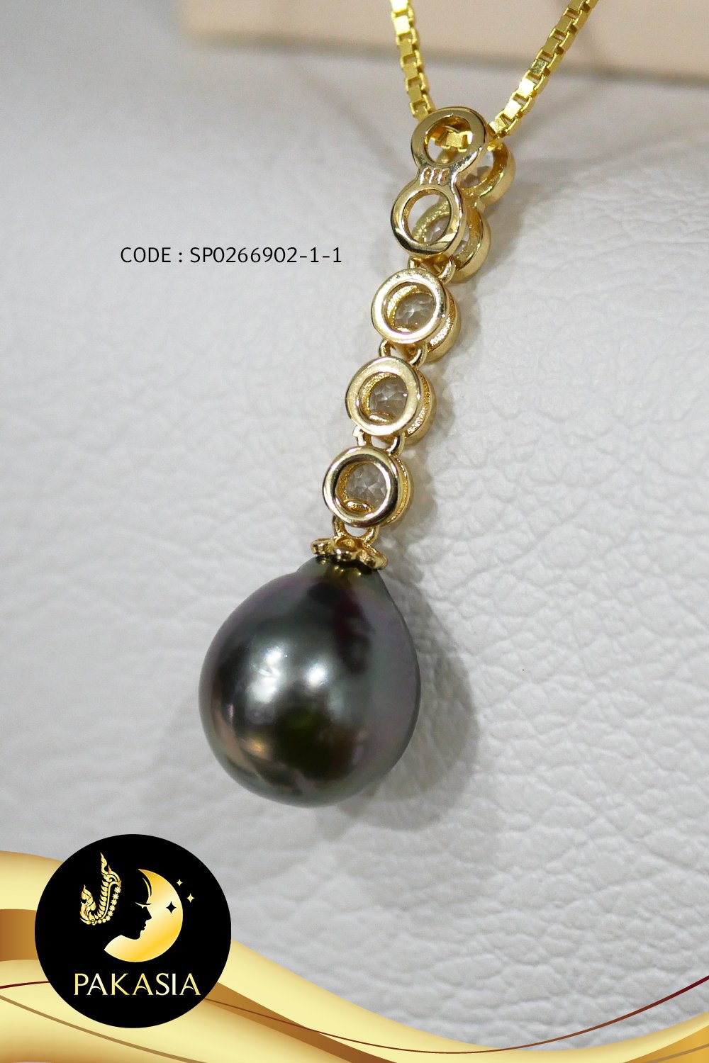 (ไม่รวมสร้อย) จี้พลอยแท้ White Topaz ห้อยมุกตาฮิติคัดเกรด สีดำ ทรงหยดน้ำกึ่งบารอก ขนาด 8-10 mm เกรด AA+ ตัวเรือนเงินแท้ 92.5 ชุบทอง ประดับพลอยแท้ White Topaz เม็ดมุกมีรอยธรรมชาติบ้าง สินค้าทุกชิ้นมีใบรับประกันมุกแท้ (Certificate of Guarantee) เม็ดมุกแต่ละเม็ดมีลักษณะเฉพาะตัว อาจมีรูปทรง ขนาด และสีต่างกันเล็กน้อย จากภาพโฆษณา