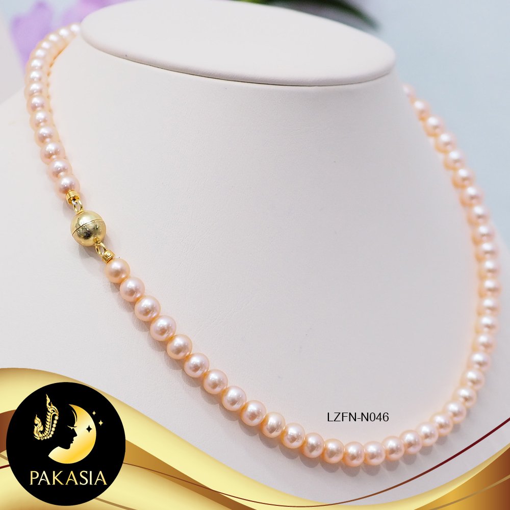 สร้อยคอมุกล้วน มุกน้ำจืดคัดเกรดพรีเมี่ยม สีพีช ทรงกลม ขนาด 6 mm เกรด AAA ตัวเรือนตะขอบอลแม่เหล็ก เงินแท้ 92.5 ชุบทอง เม็ดมุกมีรอยธรรมชาติ±3% สินค้าทุกชิ้นมีใบรับประกันมุกแท้ (Certificate of Guarantee) เม็ดมุกแต่ละเม็ดมีลักษณะเฉพาะตัว อาจมีรูปทรง ขนาด และสีต่างกันเล็กน้อย จากภาพโฆษณา