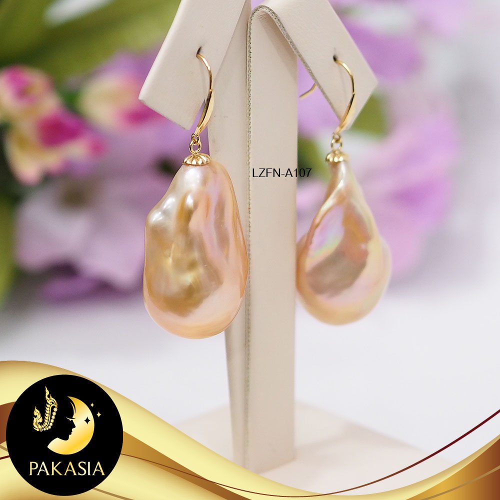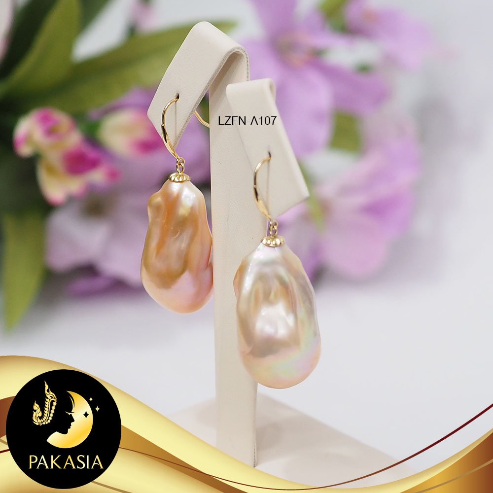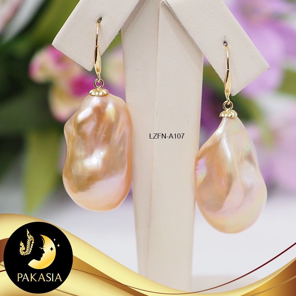 ต่างหู Fish Hooks มุกน้ำจืดคัดเกรด สีพีช ทรงบาร็อค ขนาด 16-28 mm เกรด AA+ ตัวเรือนทองแท้ 18 K เม็ดมุกแท้มีรอยธรรมชาติบ้าง สินค้าทุกชิ้นมีใบรับประกันมุกแท้ (Certificate of Guarantee) เม็ดมุกแต่ละเม็ดมีลักษณะเฉพาะตัว อาจมีรูปทรง ขนาด และสีต่างกันเล็กน้อย จากภาพโฆษณา