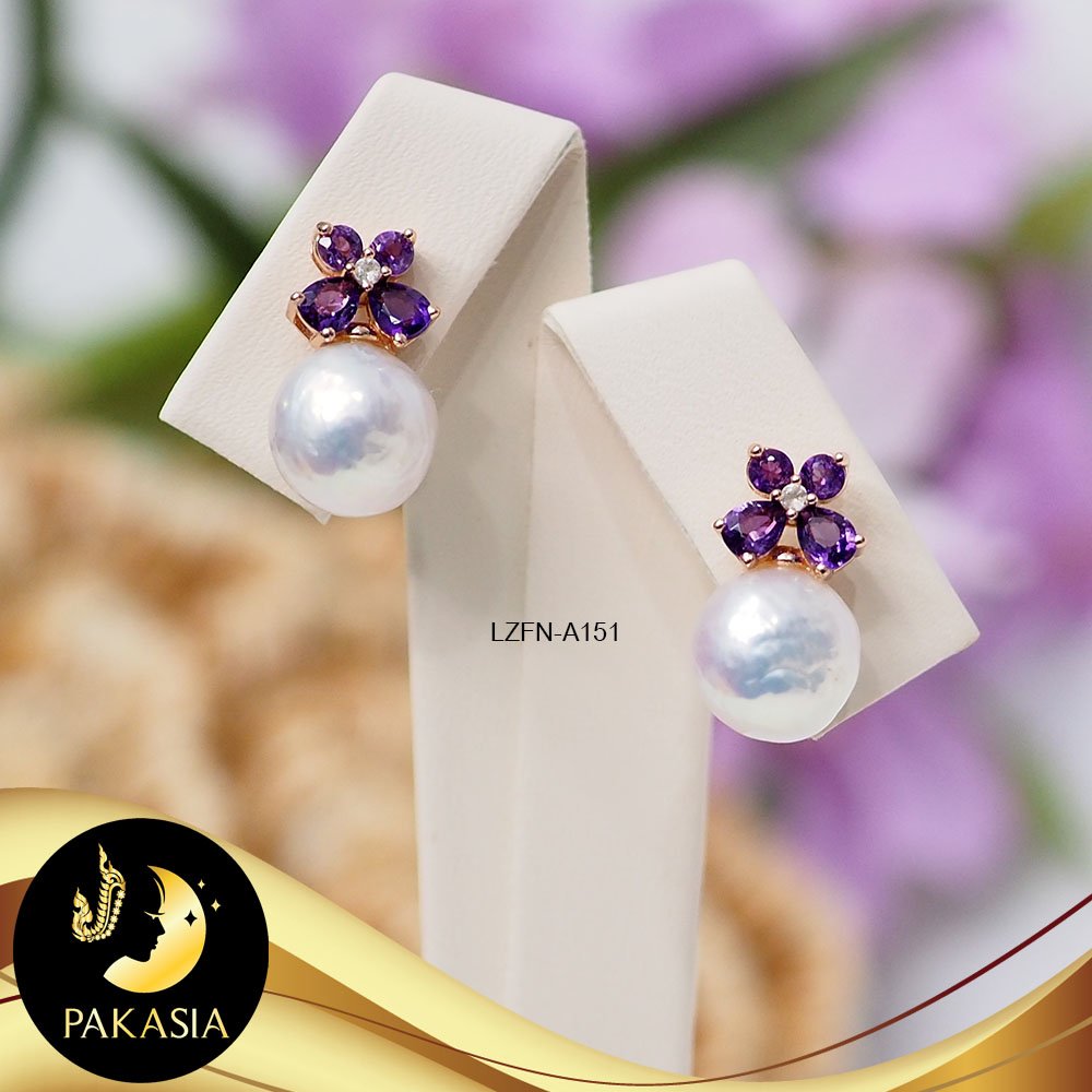 ต่างหูติดหูพลอยแท้ Amethyst ห้อยมุกแท้ / LZFN-A151 / ง151