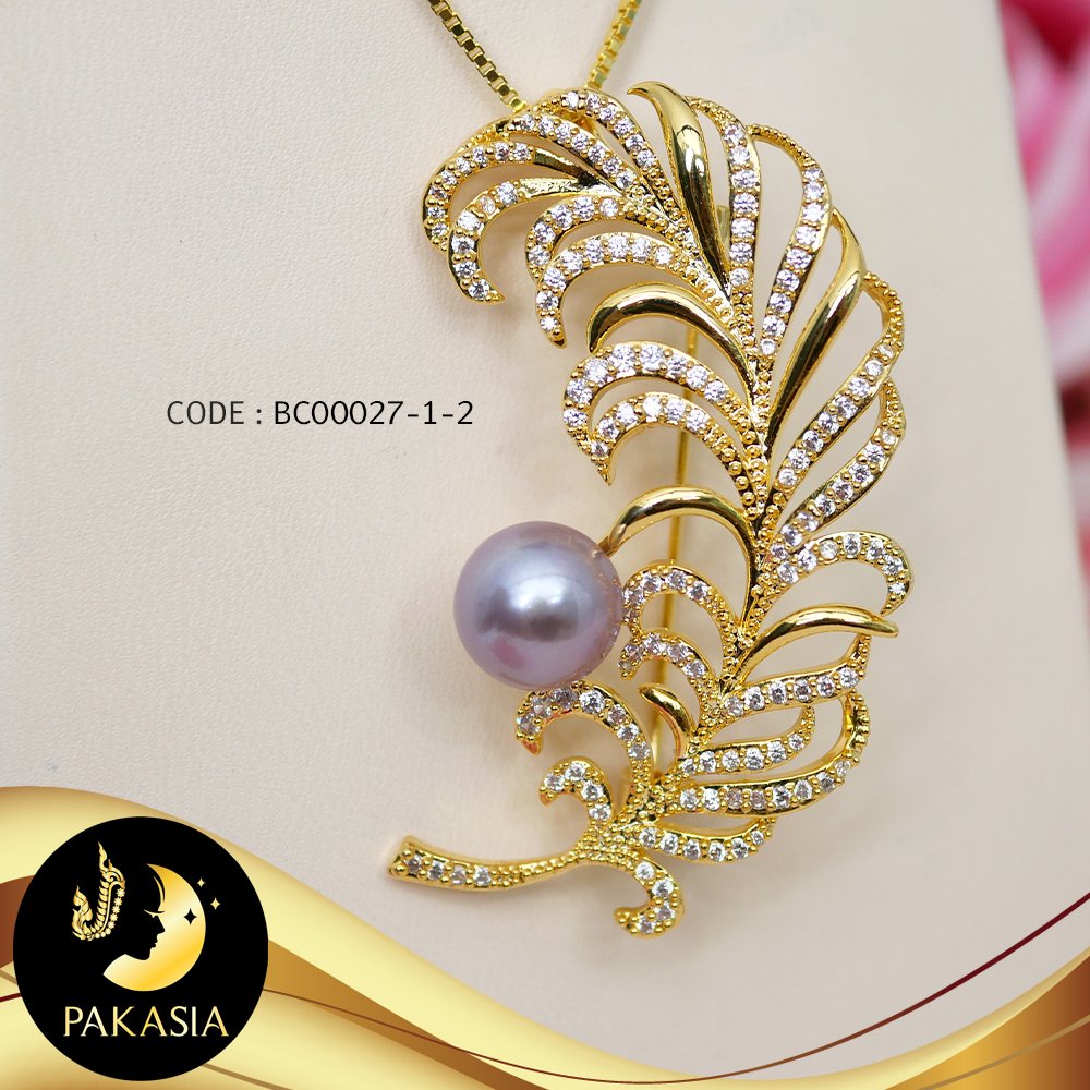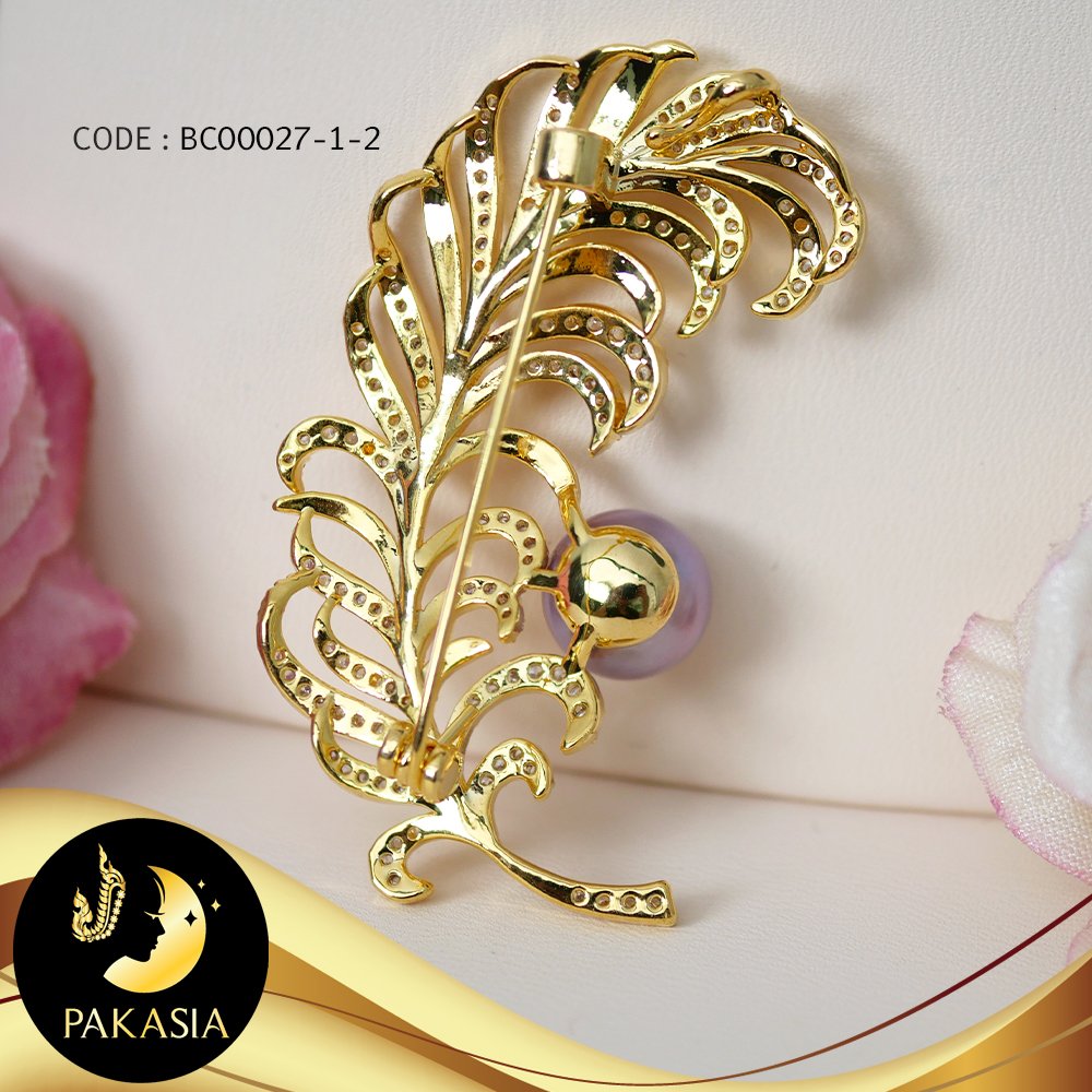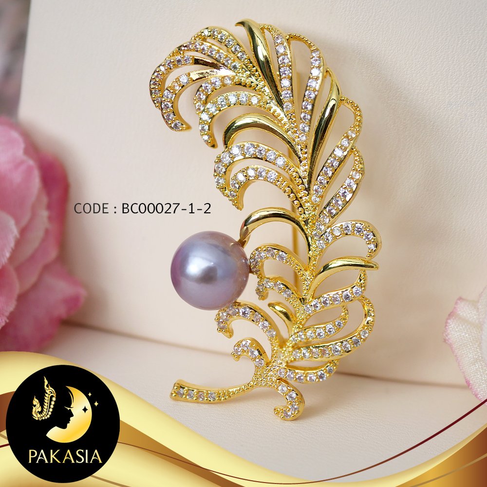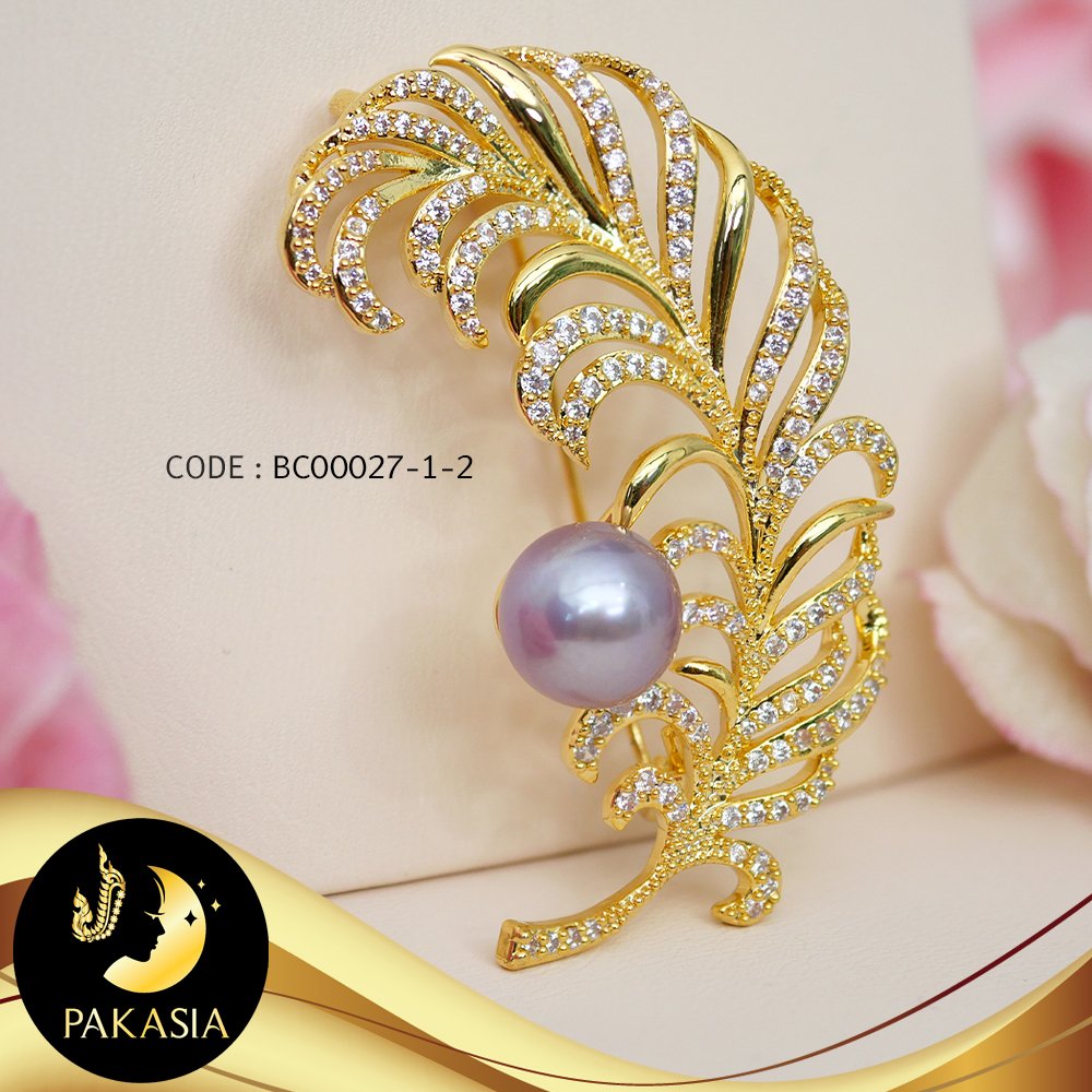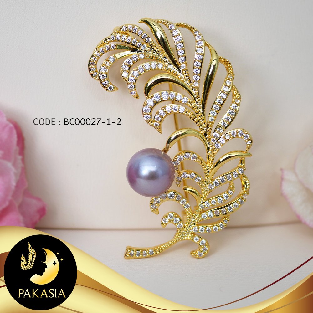 เข็มกลัดขนนก มุก Edison น้ำจืดคัดเกรด สีม่วง ทรงกลม ขนาด 8-9 mm เกรด AA+ ตัวเรือน ขนาดความกว้าง 5 cm ตัวเรือน Alloy ชุบทอง ประดับเพชร CZ เม็ดมุกแต่ละเม็ดมีลักษณะเฉพาะตัว อาจมีรูปทรง ขนาด และสีต่างกันเล็กน้อย จากภาพโฆษณา สินค้าทุกชิ้นมีใบรับประกันมุกแท้ (Certificate of Guarantee)