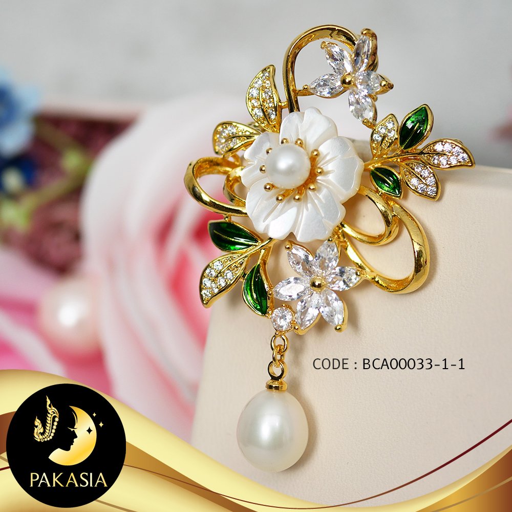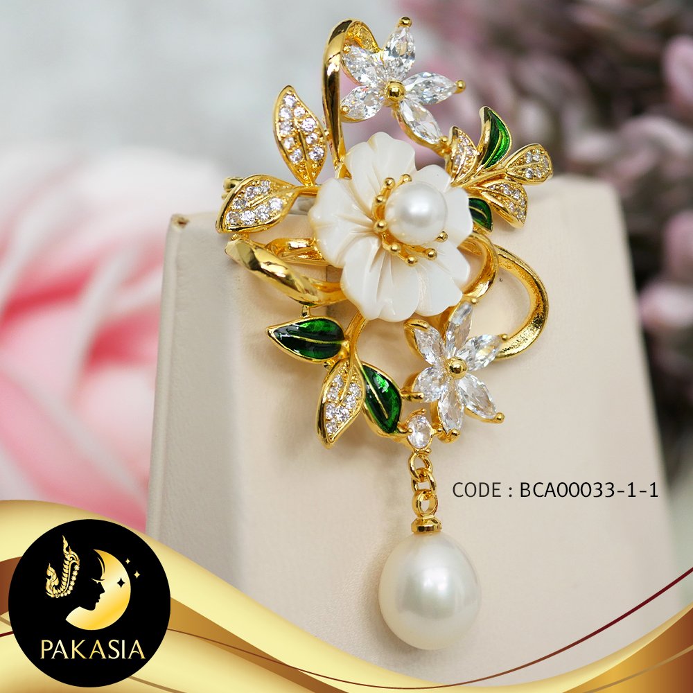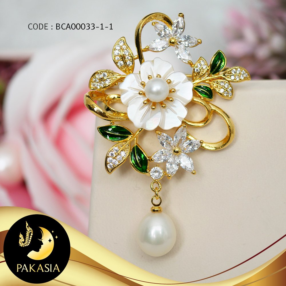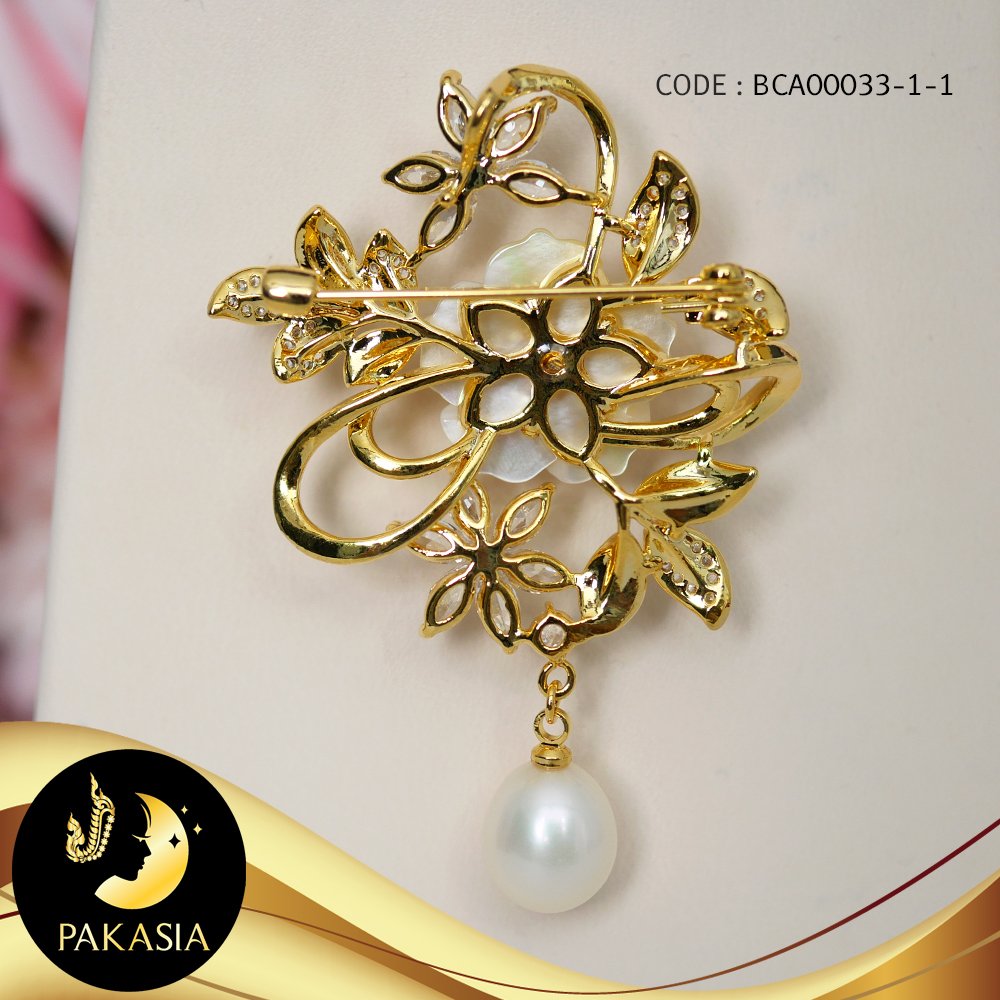 เข็มกลัดมุกช่อดอกซากุระ มุกน้ำจืดคัดเกรด สีขาว ทรงกลมและหยดน้ำ ขนาด 5.5-9 mm เกรด AA+ ตัวเรือน Alloy ชุบทอง ประดับเปลือกหอยมุกและเพชร CZ / K239 / ก239