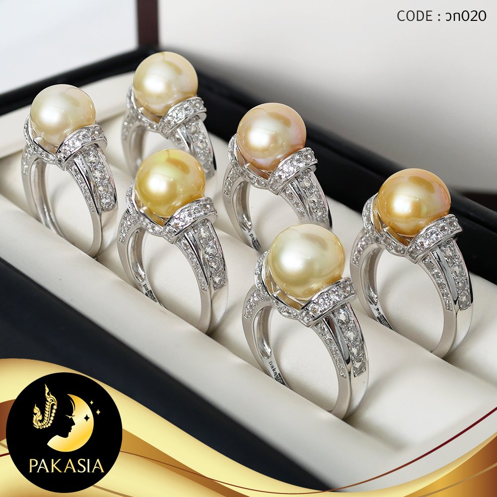 • แหวนมุกเม็ดเดี่ยว ริบบิ้นโอบมุก บ่าแหวนประดับพลอยแท้ มุก South Sea น้ำเค็มคัดเกรด สีทอง-Light Gold ทรงเกือบกลม ขนาด 10 mm เกรด AA+