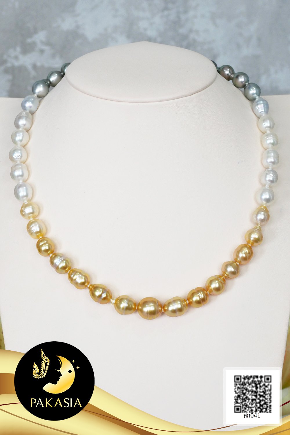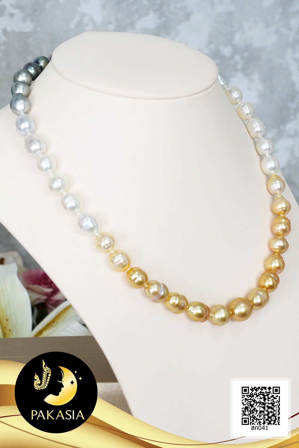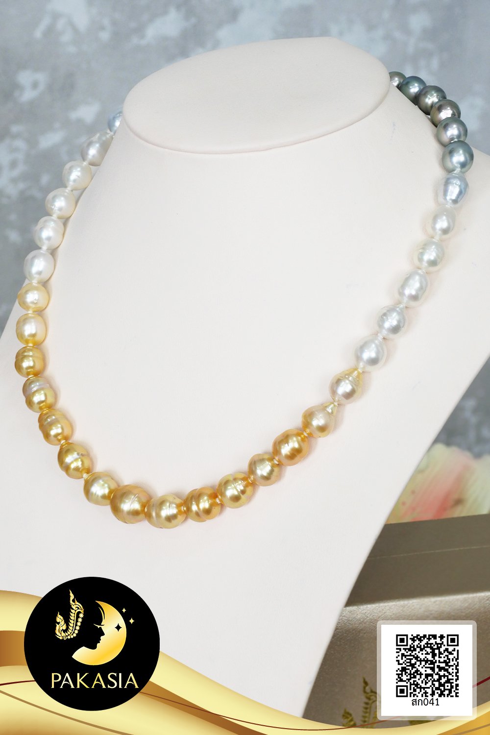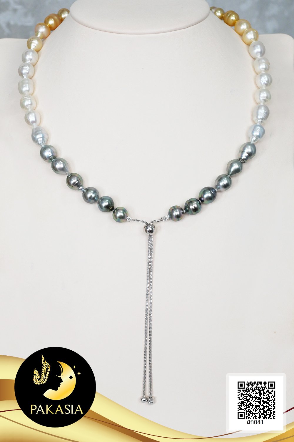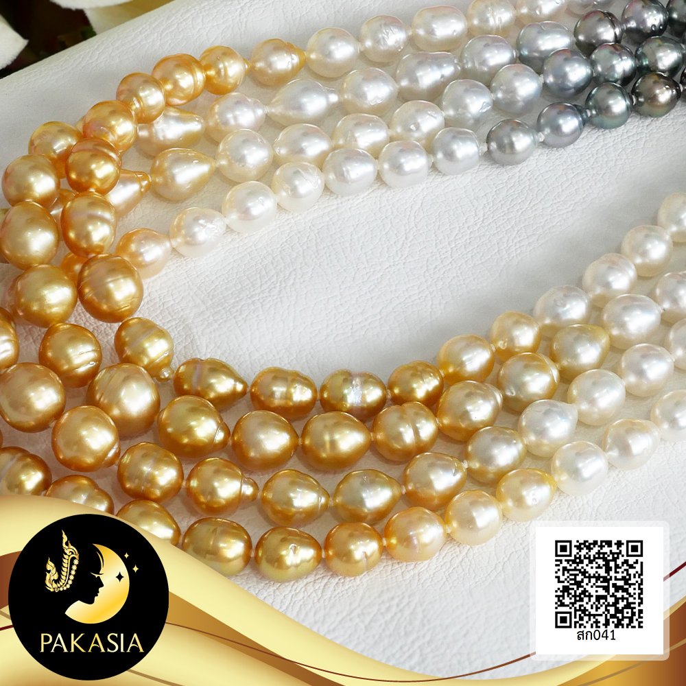 สร้อยคอไข่มุกล้วนไล่ระดับ (Graduated Necklace) ไล่สีดำ-ขาว-ทอง ตะขอล็อคบอลซิลิโคนสร้อยปรับรูดความยาวได้ ไข่มุก South Sea และ ไข่มุกตาฮิติ น้ำเค็มคัดเกรด ไล่ระดับสี ดำ-ขาว-ทอง ทรงบารอก ขนาด 8.5-11.5 mm เกรด AA+ ตัวเรือนตะขอล็อคบอลซิลิโคนสร้อยปรับรูดได้ เงินแท้ 92.5 ชุบทองคำขาว สร้อยคอร้อยผูกปมทุกเม็ดด้วยไหมญี่ปุ่นอย่างดี เม็ดมุกแท้มีรอยธรรมชาติ ±5% สินค้าทุกชิ้นมีใบรับประกันมุกแท้ (Certificate of Guarantee) เม็ดมุกแต่ละเม็ดมีลักษณะเฉพาะตัว อาจมีรูปทรง ขนาด และสีต่างกันเล็กน้อย จากภาพโฆษณา