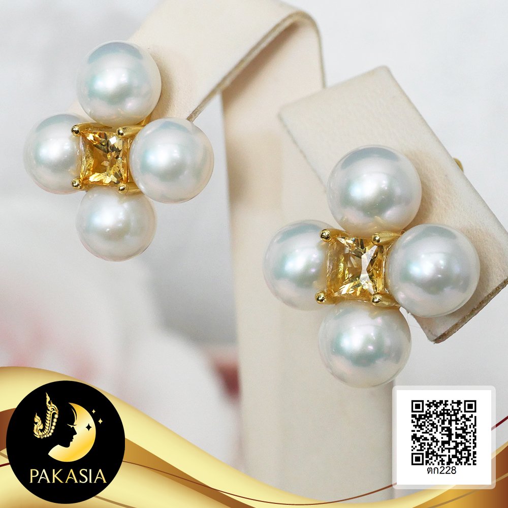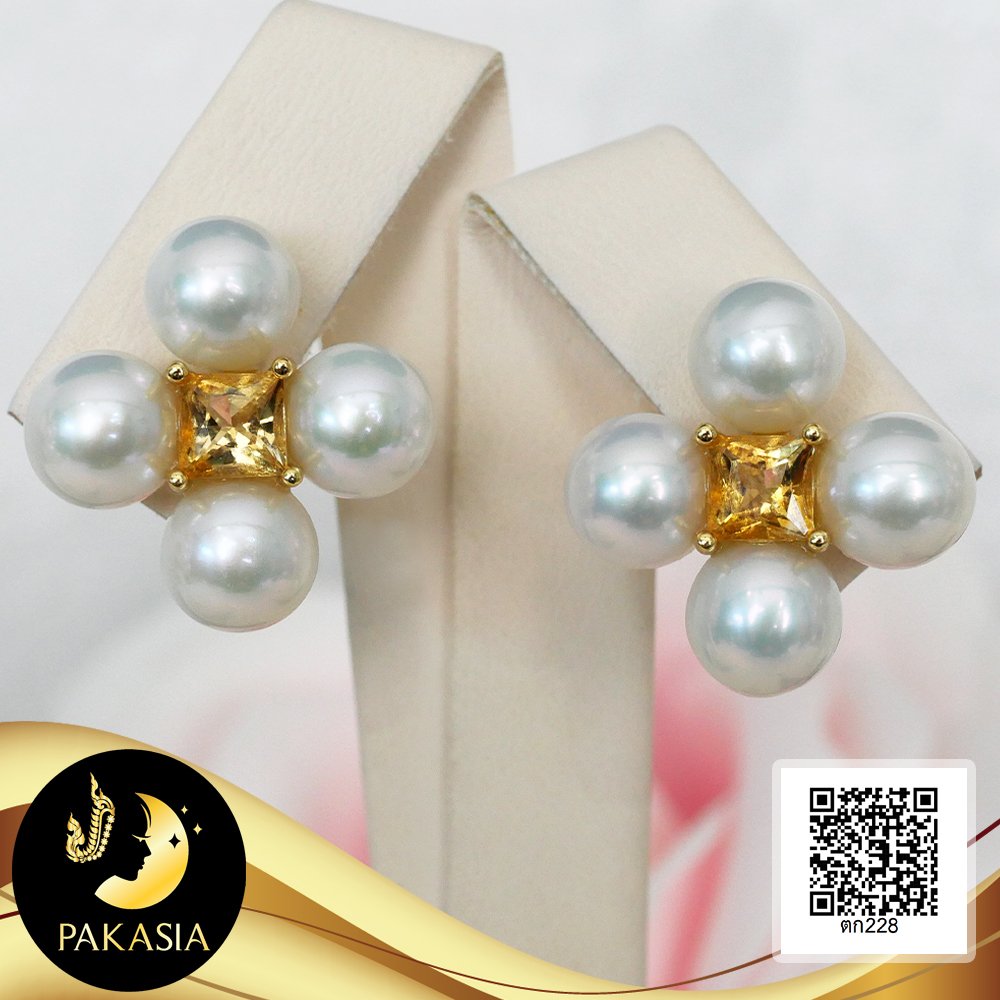 ต่างหูพลอย Citrine แท้ ทรง Princess ล้อมไข่มุก 4 เม็ด ไข่มุก Edison น้ำจืดคัดเกรด สีขาว ทรงกลม ขนาด 7.5-8 mm เกรด AAA ตัวเรือนต่างหู Stud เงินแท้ 92.5 ชุบทอง พลอยแท้ Citrine 1 ct / 9.5.64