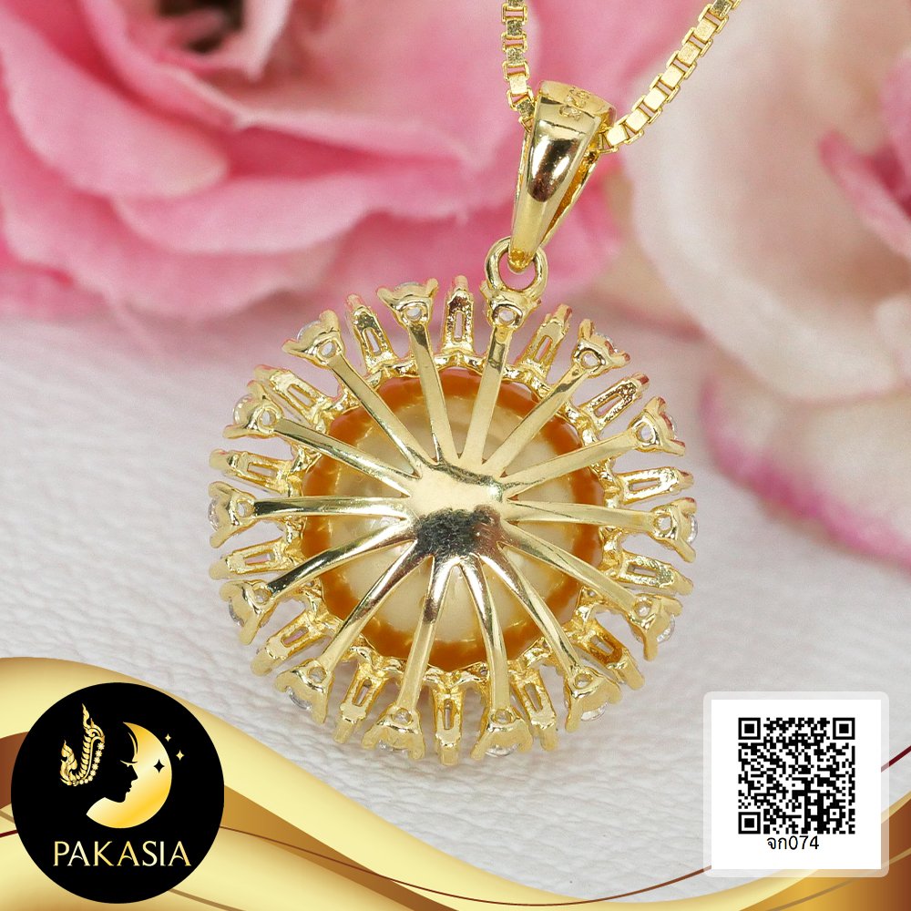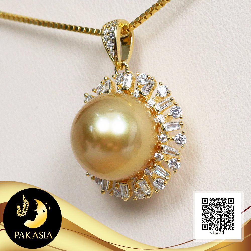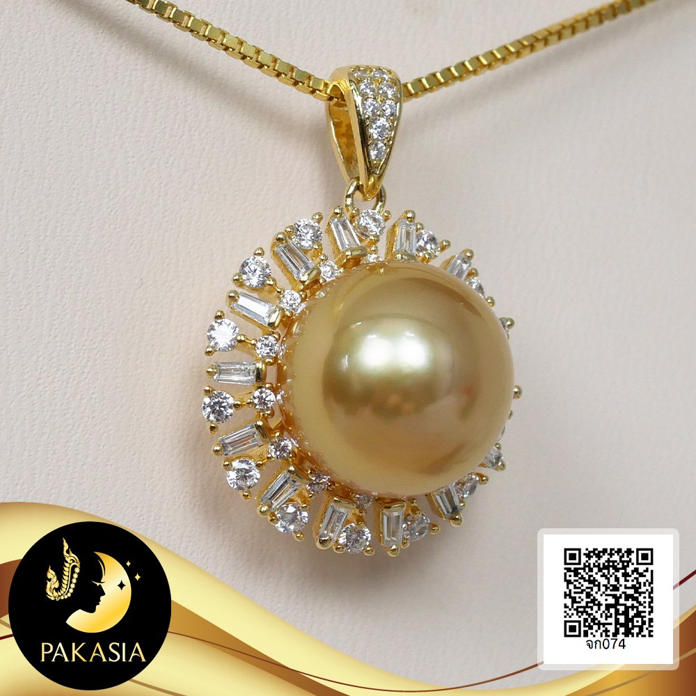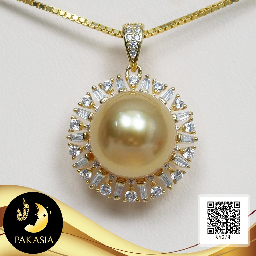 จี้เพชรบาเก็ตรัศมี ล้อมไข่มุก South Sea น้ำเค็มคัดเกรด สีทอง Deep Gold ทรงเกือบกลม ขนาด 12 mm เกรด AA+ ตัวเรือนจี้เงินแท้ 92.5 ชุบทอง ประดับเพชร CZ เม็ดมุกมีรอยธรรมชาติ ±5% สินค้าทุกชิ้นมีใบรับประกันมุกแท้ (Certificate of Guarantee) เม็ดมุกแต่ละเม็ดมีลักษณะเฉพาะตัว อาจมีรูปทรง ขนาด และสีต่างกันเล็กน้อย จากภาพโฆษณา