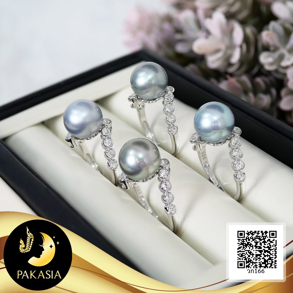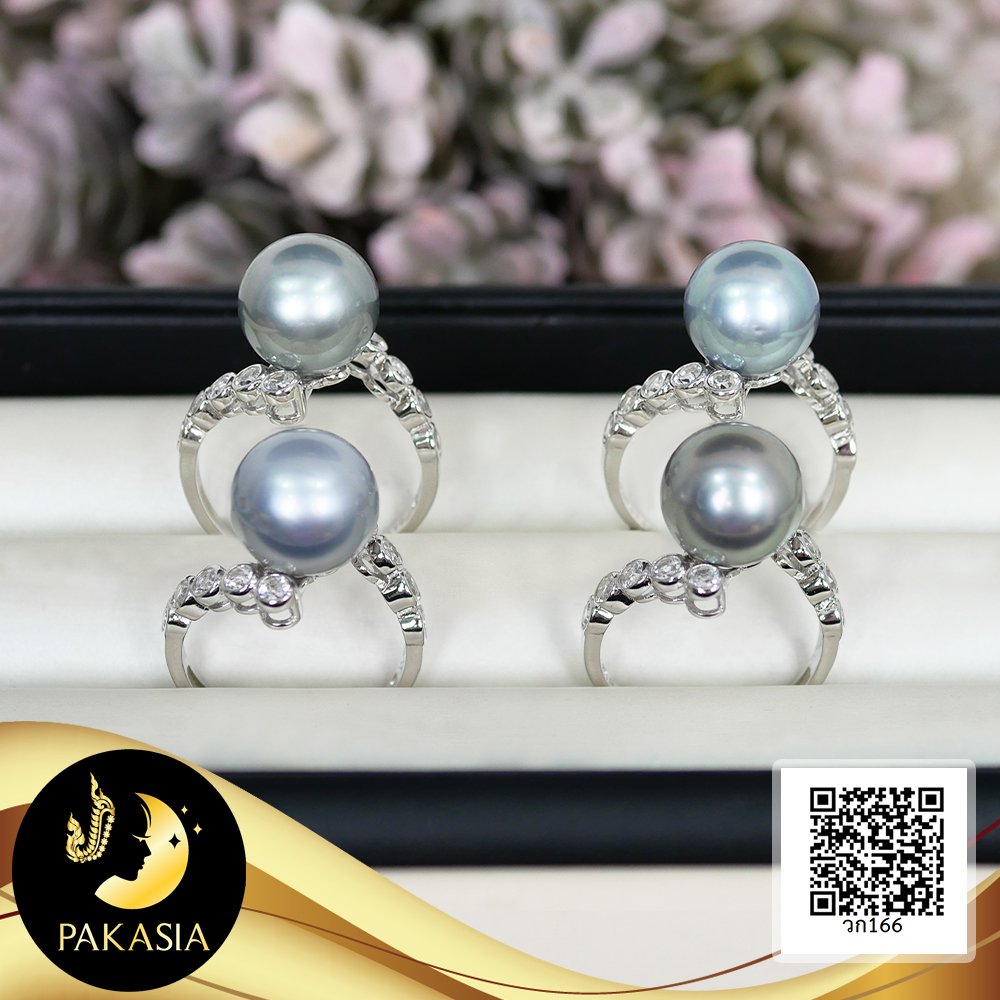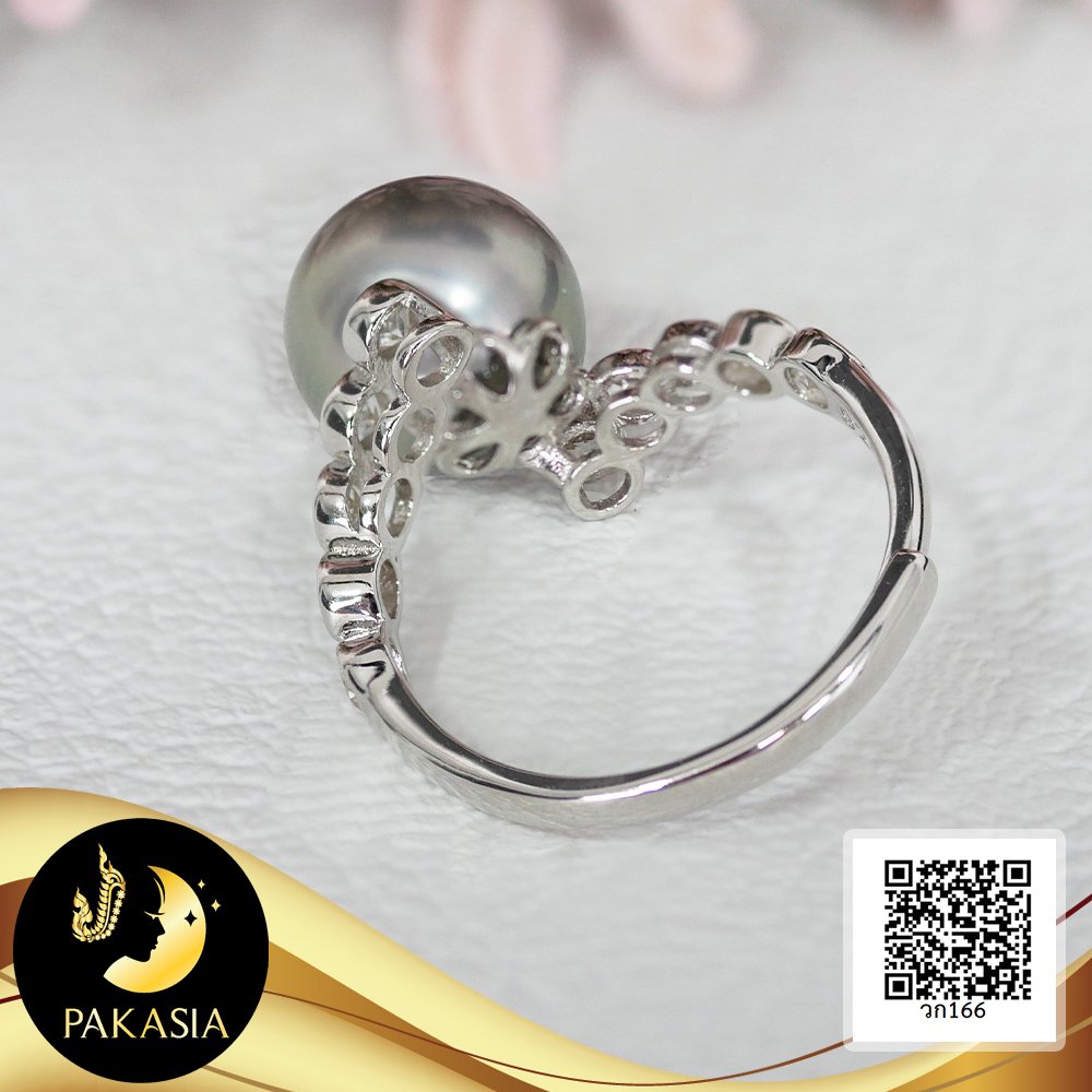 แหวนบ่าพลอยไข่ปลา ไข่มุก ตาฮิติ เม็ดเดี่ยว ไข่มุก ตาฮิติ สีเทา ทรงกลม ขนาด 11 mm เกรด AA+ ตัวเรือนแหวนเงินแท้ 92.5 ชุบทองคำขาว บ่าแหวนประดับพลอยแท้ White Topaz / 13.6.64