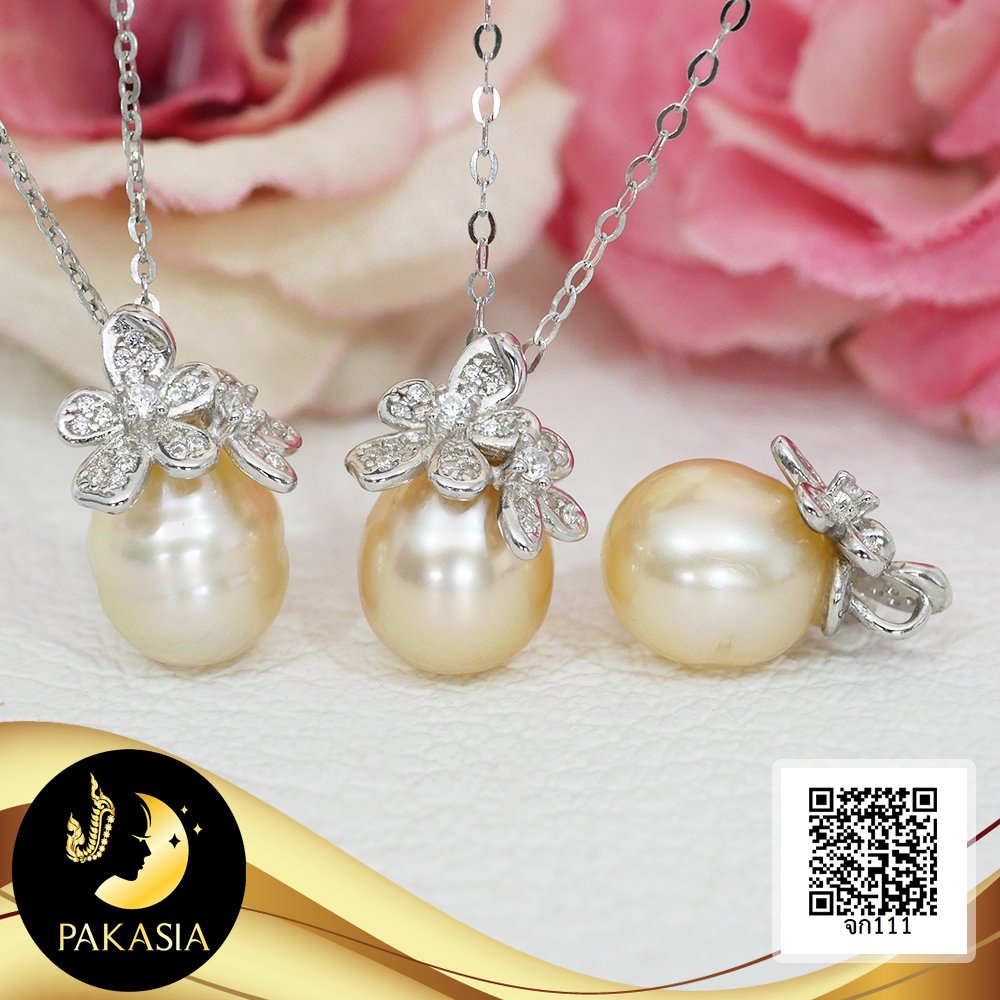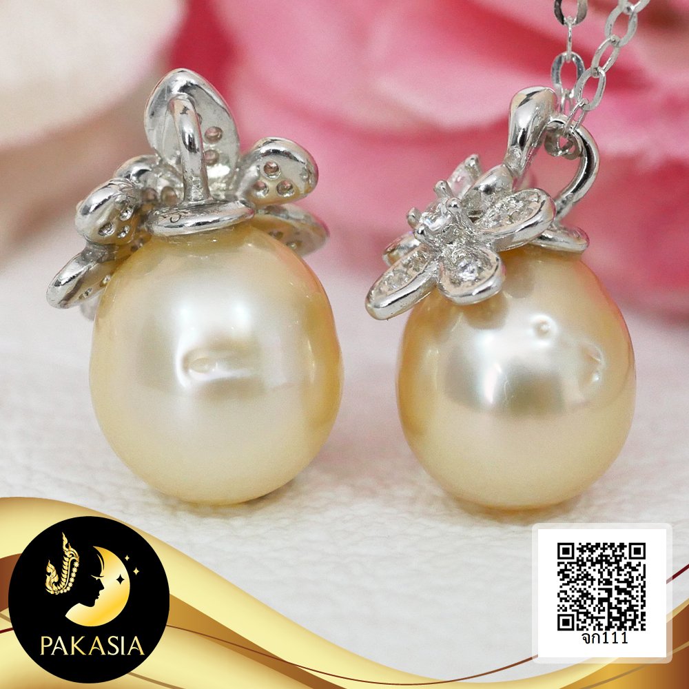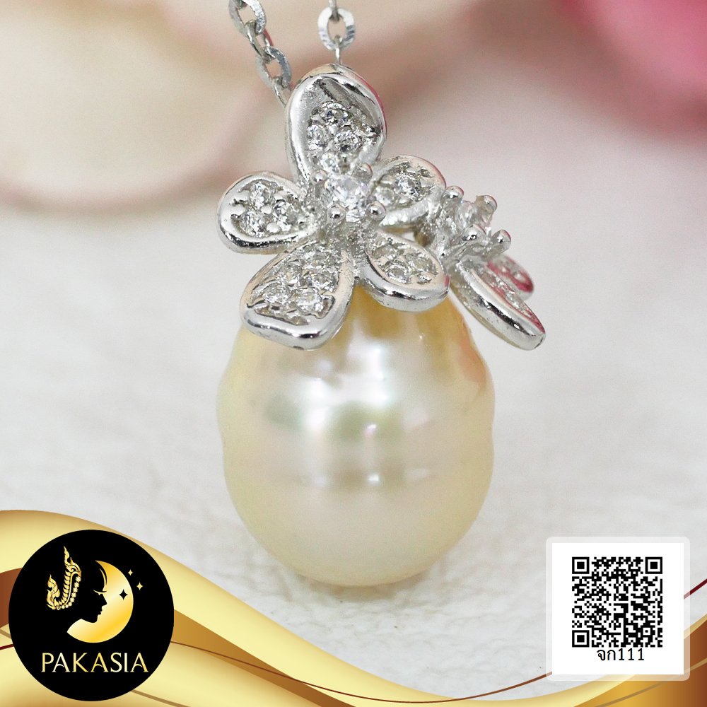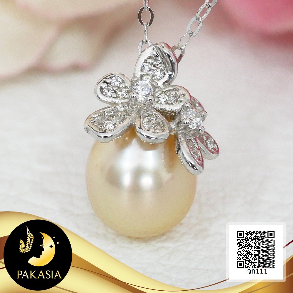 (ไม่รวมสร้อย) จี้ดอกอูมิโกะจิ๋ว ห้อยไข่มุก South Sea น้ำเค็มคัดเกรด สีทองอ่อน ทรงหยดน้ำ-ทรงบารอก ขนาด 8-9 mm เกรด AA+ ตัวเรือนเงินแท้ 92.5 ชุบทองคำขาว ประดับเพชร CZ เม็ดมุกมีรอยธรรมชาติเพียง 5% สินค้าทุกชิ้นมีใบรับประกันมุกแท้ (Certificate of Guarantee) เม็ดมุกแต่ละเม็ดมีลักษณะเฉพาะตัว อาจมีรูปทรง ขนาด และสีต่างกันเล็กน้อย จากภาพโฆษณา