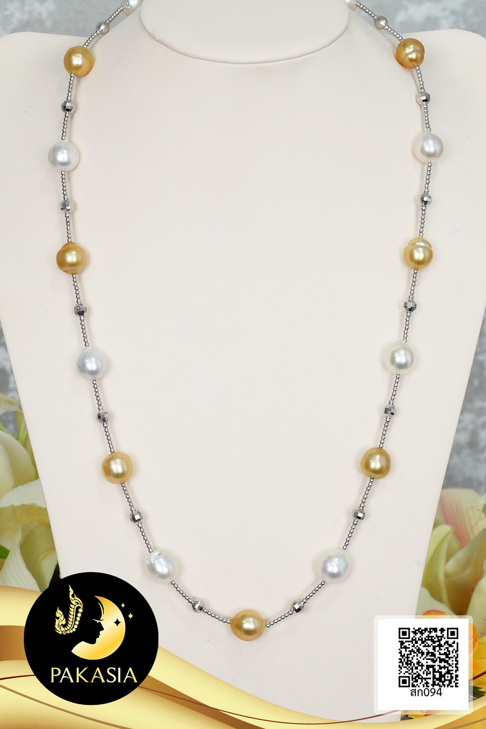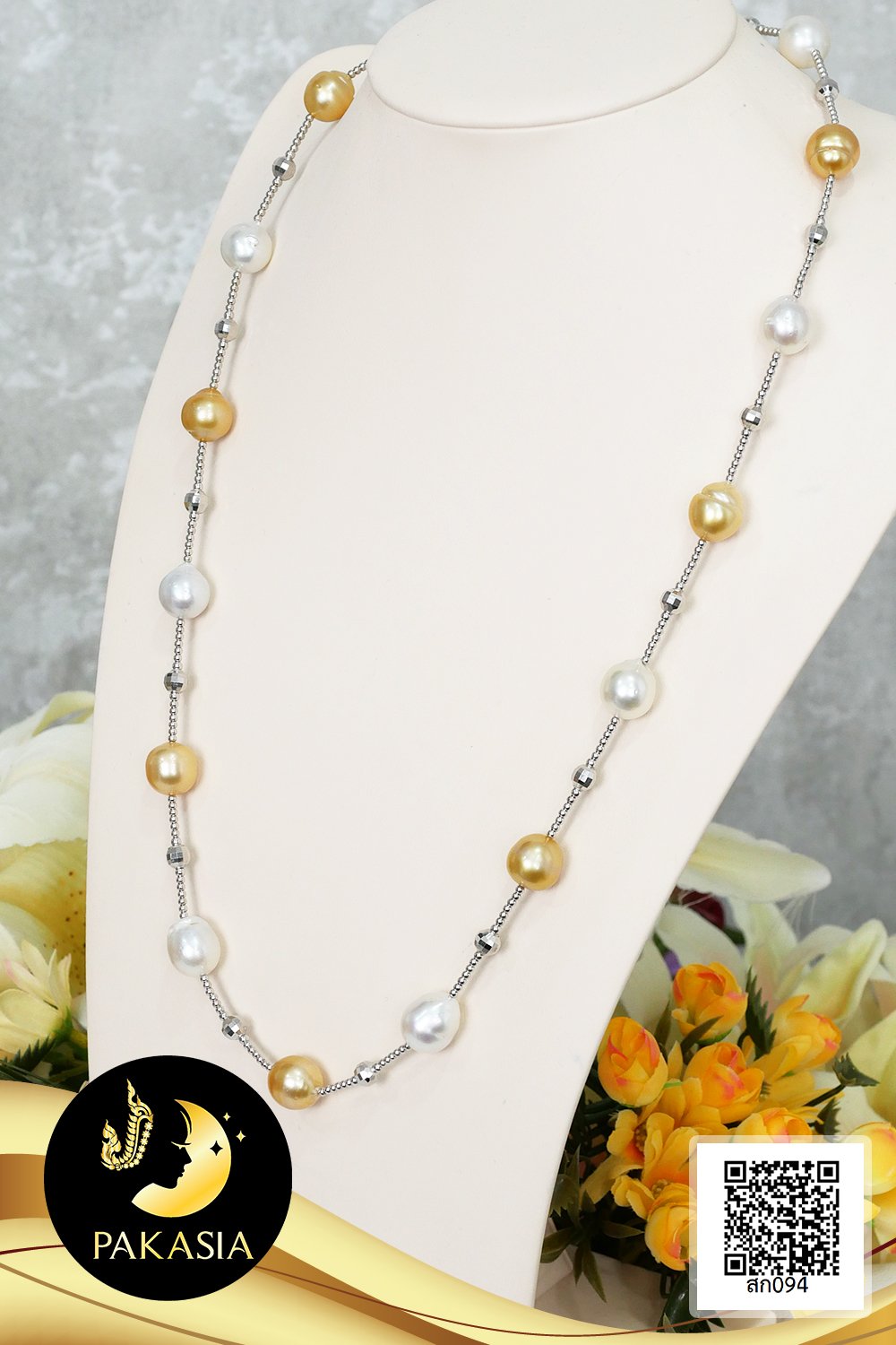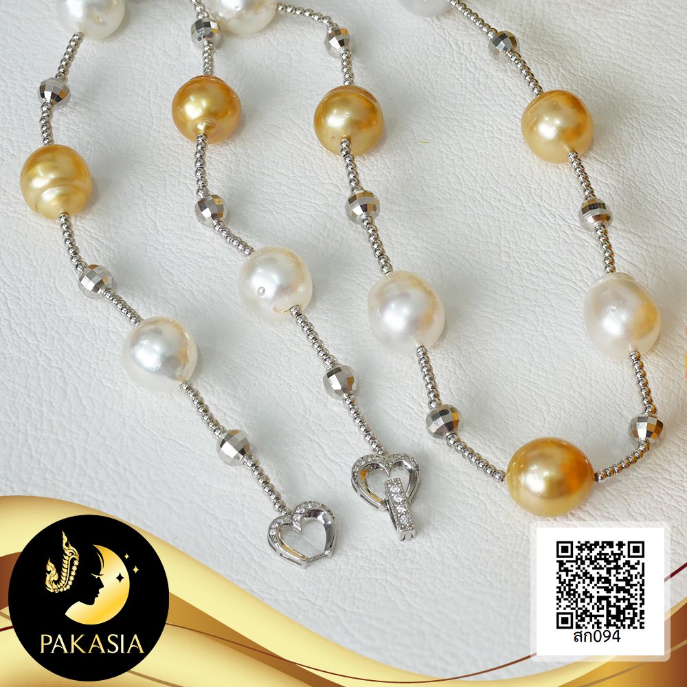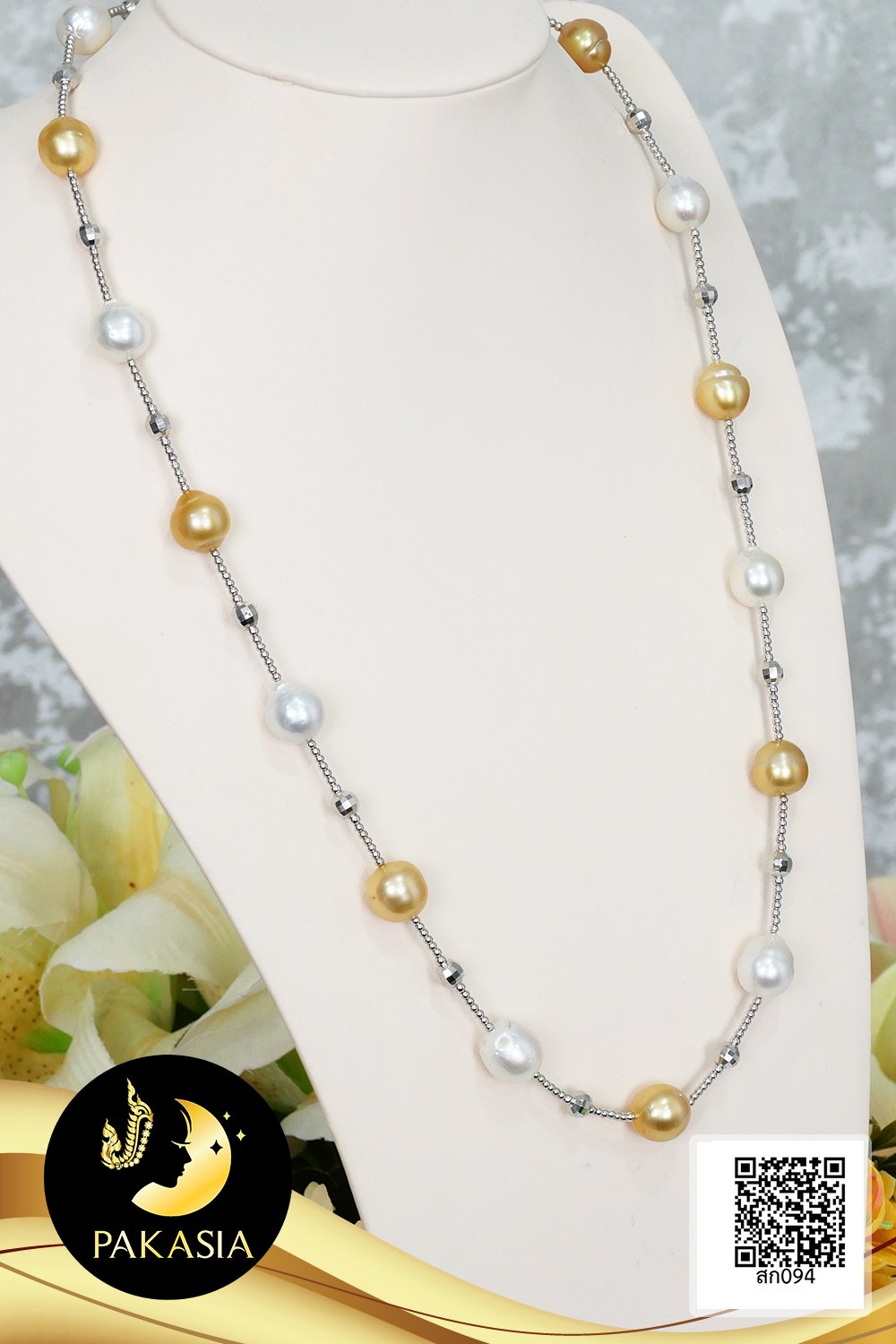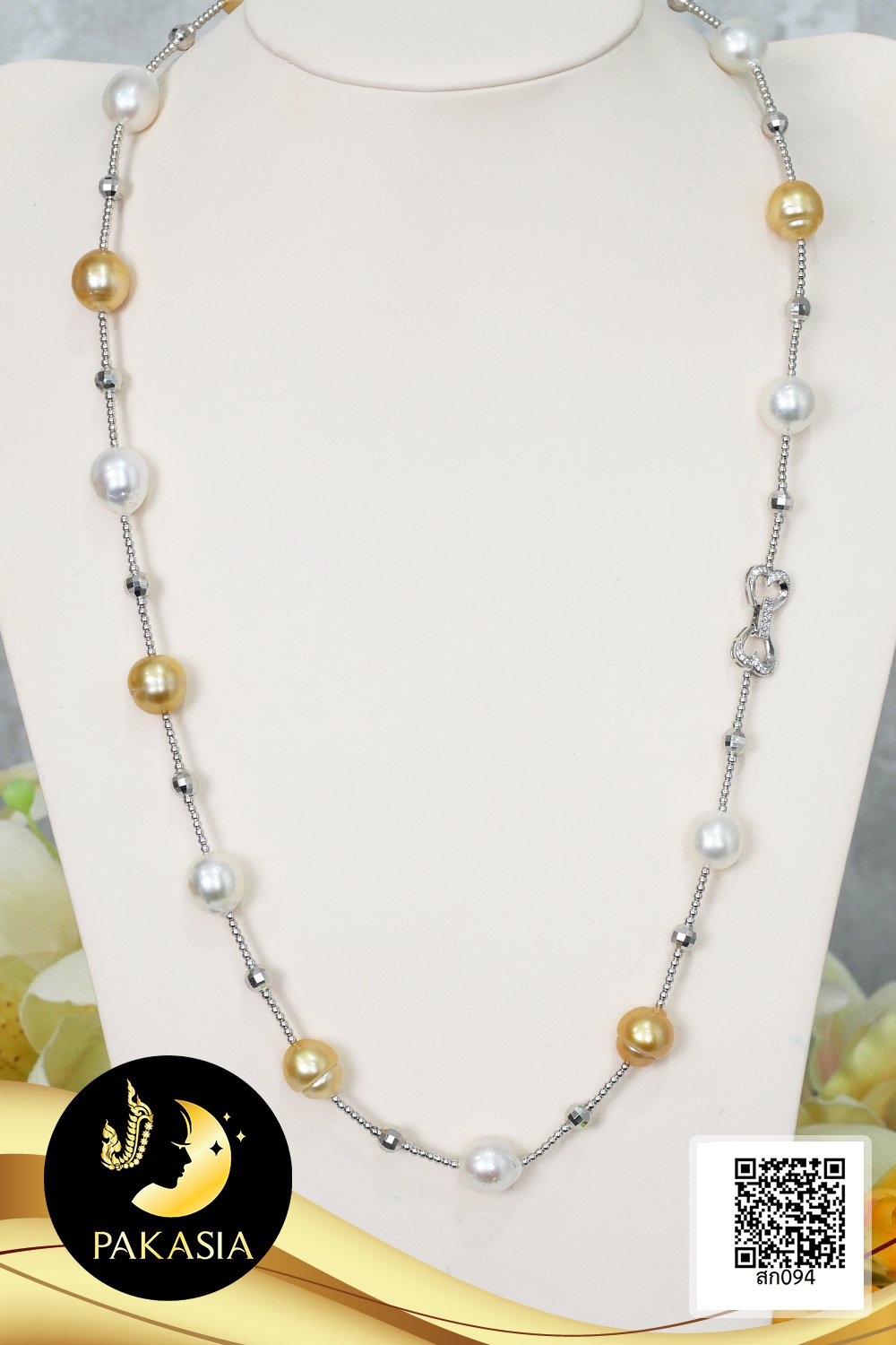 สร้อยคอไข่มุกระยะสลับบอลเงินตัดลาย ใหญ่ คั่นเม็ดบอลเกลี้ยงเล็ก ความยาวประมาณ 28" ไข่มุก South Sea น้ำเค็มคัดเกรด สีขาว-ทอง ทรงบารอก ขนาด 12-13 mm เกรด AA ตะขอหัวใจโบว์ เงินแท้ 92.5 ชุบทองคำขาว ประดับเพชร CZ เม็ดมุกมีรอยธรรมชาติ สินค้าทุกชิ้นมีใบรับประกันมุกแท้ (Certificate of Guarantee) เม็ดมุกแต่ละเม็ดมีลักษณะเฉพาะตัว อาจมีรูปทรง ขนาด และสีต่างกันเล็กน้อย จากภาพโฆษณา