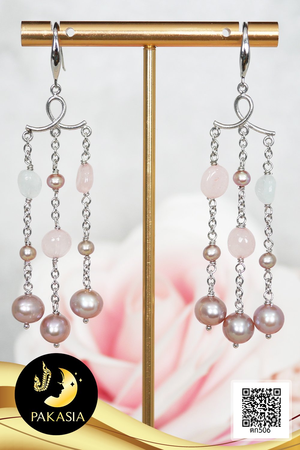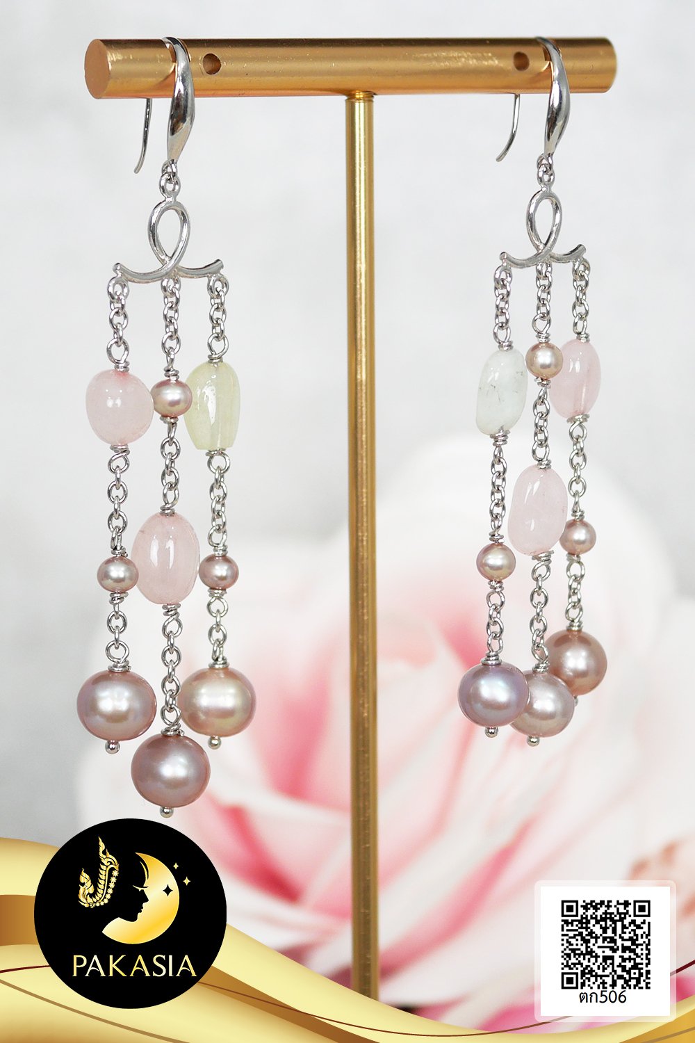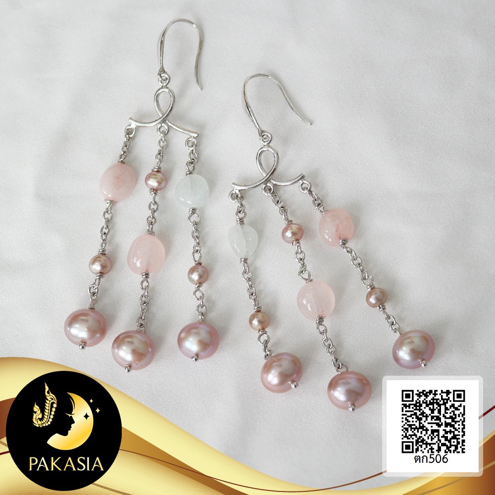 ต่างหูหิน Rose Quartz แท้คั่นไข่มุกห้อยระย้า ไข่มุกน้ำจืดคัดเกรด สีม่วง ทรงกลม-ไข่ ขนาด 4-8 mm เกรด AA ตัวเรือนต่างหูแบบ Fish Hooks สร้อยโซ่ เงินแท้ 92.5 ชุบทองคำขาว เม็ดมุกมีรอยธรรมชาติ สินค้าทุกชิ้นมีใบรับประกันมุกแท้ (Certificate of Guarantee) เม็ดมุกแต่ละเม็ดมีลักษณะเฉพาะตัว อาจมีรูปทรง ขนาด และสีต่างกันเล็กน้อย จากภาพโฆษณา