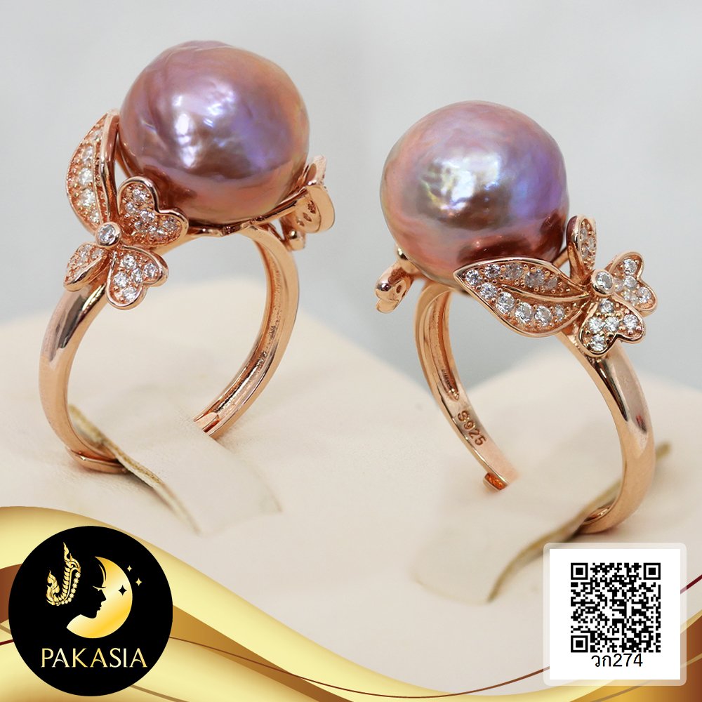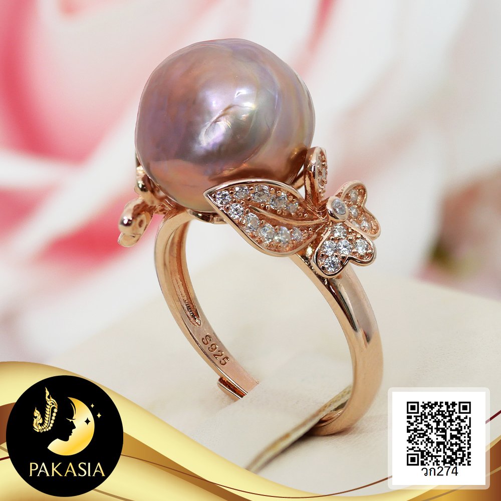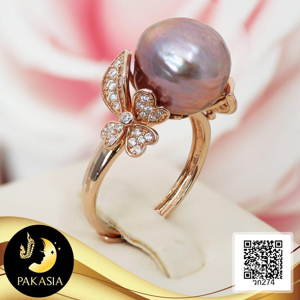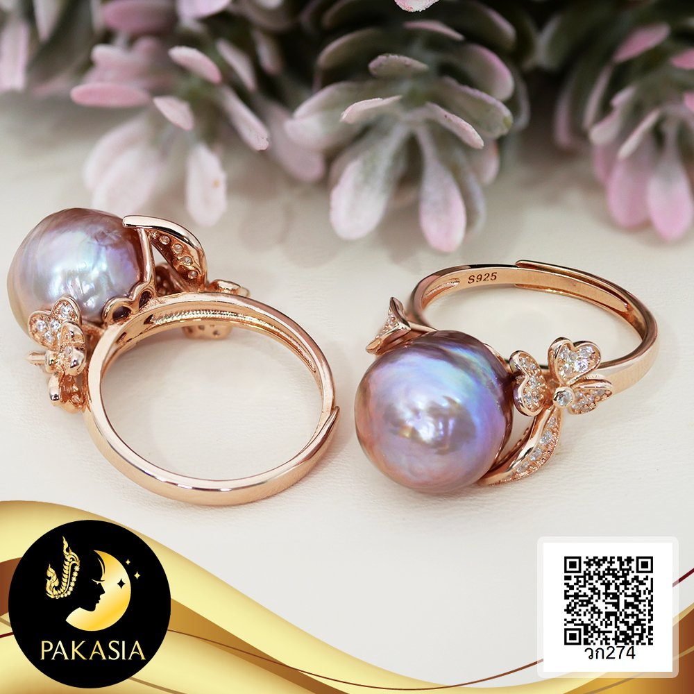 แหวนไข่มุกเม็ดเดี่ยว บ่าใบโคลเวอร์ ประดับเพชร ไข่มุกน้ำจืดคัดเกรด สีม่วงประกายรุ้ง ทรงบารอก ขนาด 10-11 mm เกรด AA+ ตัวเรือนแหวนใบโคลเวอร์ เงินแท้ 92.5 ชุบ Rose Gold ประดับเพชร CZ / 11.8.64
