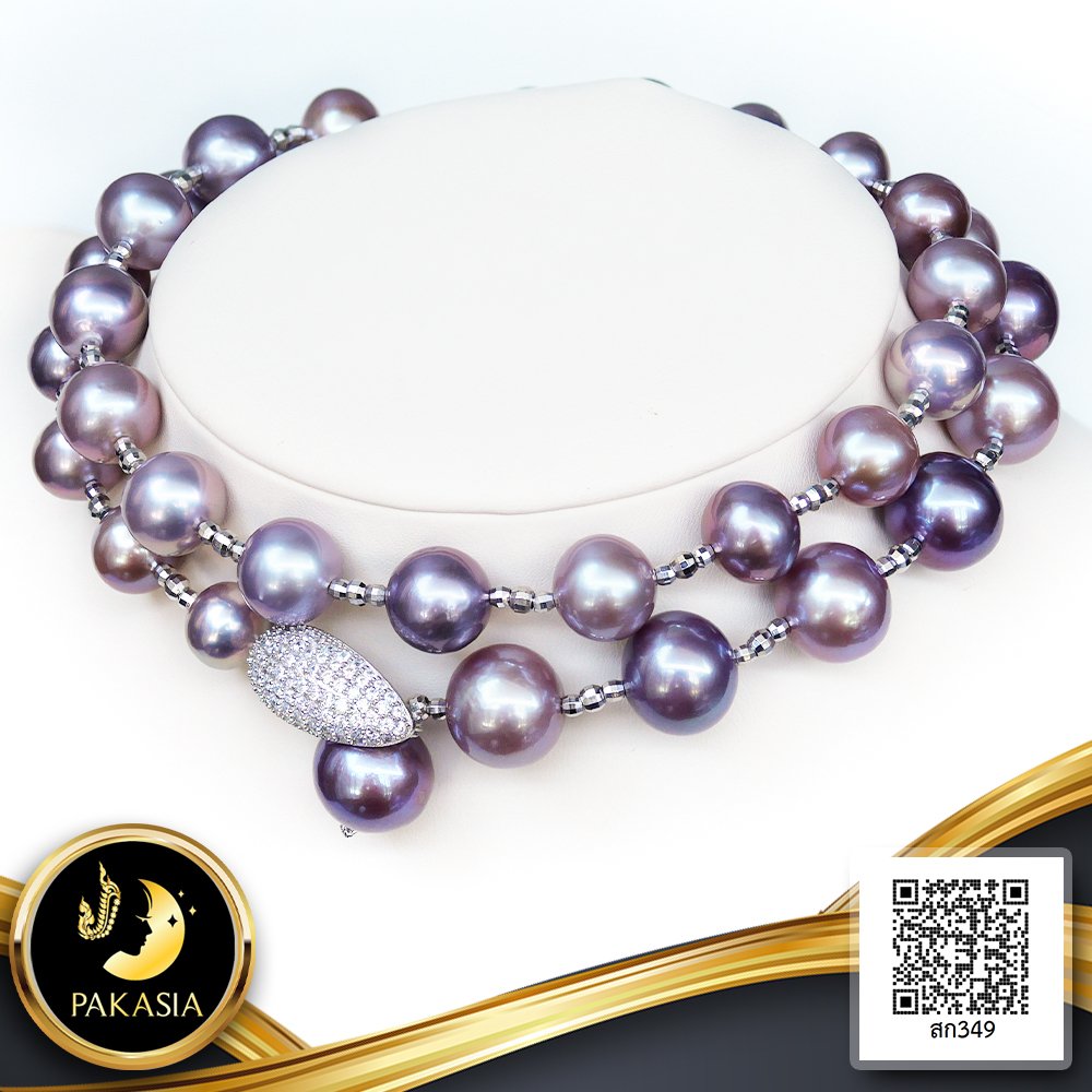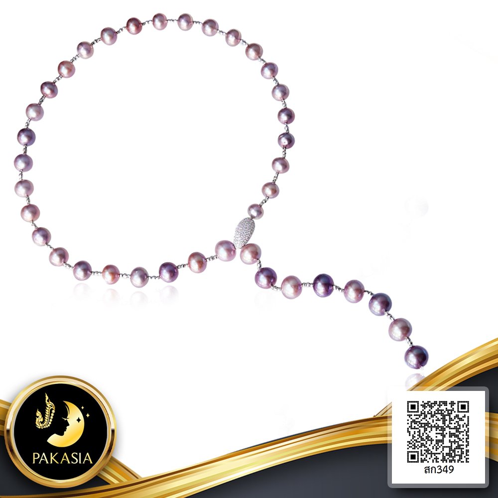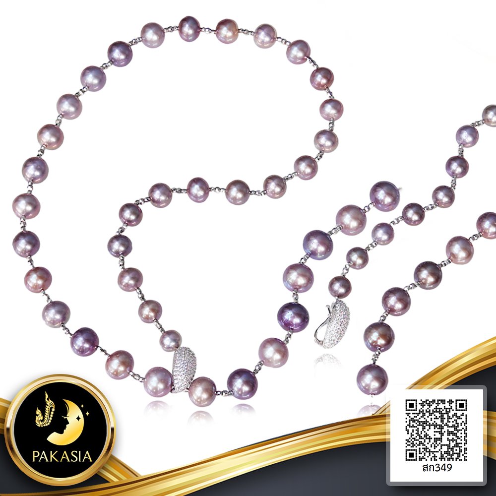 สร้อยคอไข่มุกระยะ คั่นบอลกลมตัดลาย (ความยาวประมาณ 26" ไม่รวมตะขอ) ไข่มุก Edison สายพันธุ์น้ำจืดคัดเกรด สีม่วง ทรงเกือบกลม ขนาด 8.5-12.0 mm เกรด AA - AA+ ตัวเรือน บอลกลมตัดลาย ตะขอหลังเต่าประดับเพชร CZ แบบงับ วัสดุเงินแท้ 925 ชุบสีทองคำขาว เม็ดมุกแท้มีรอยธรรมชาติ±5% สินค้าทุกชิ้นมีใบรับประกันมุกแท้ (Certificate of Guarantee) เม็ดมุกแต่ละเม็ดมีลักษณะเฉพาะตัว อาจมีรูปทรง ขนาด และสีต่างกันเล็กน้อย จากภาพโฆษณา