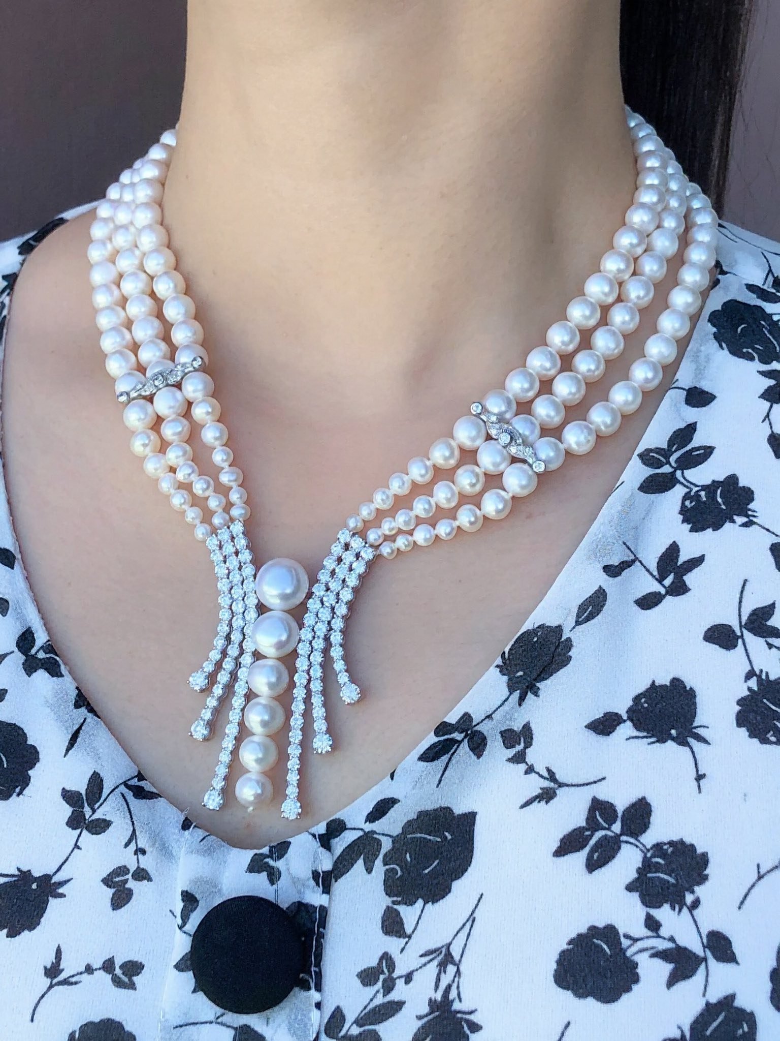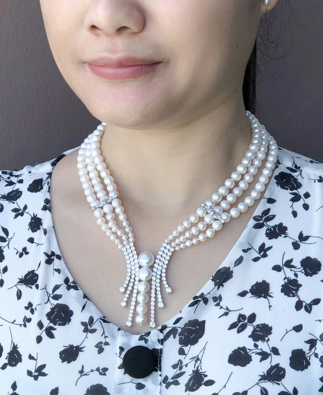 สร้อยคอ 3 สายจี้หยาดเพชร ไข่มุก Freshwater Pearl ล้วนแบบไล่ระดับ 3 สาย ยาว 19.0"รวมตะขอ ไข่มุก Freshwater Pearl สายพันธุ์น้ำจืดคัดเกรด สีขาว ทรงซาลาเปา-ไข่ ขนาด 3.0-11.0 mm เกรด AA คั่นด้วยข้อเพชร พร้อมจี้หยาดเพชร ตัวเรือนตะขอ 3 สายก้ามปู พร้อมโซ่ปรับระดับ วัสดุเงินแท้ 925 ชุบสีทองคำขาว ประดับเพชร CZ