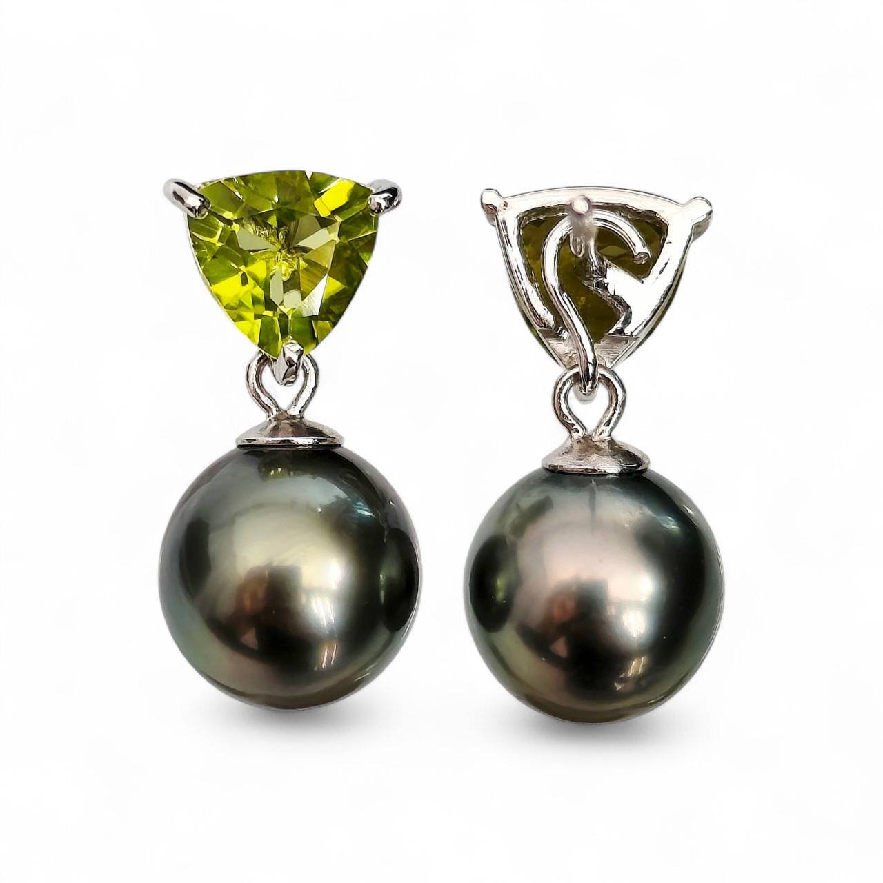 Approx. 9.0 mm, Tahitian Pearl, Peridot Trilliant Shape Stud Earrings Hooks with Dangle Pearl Jacket