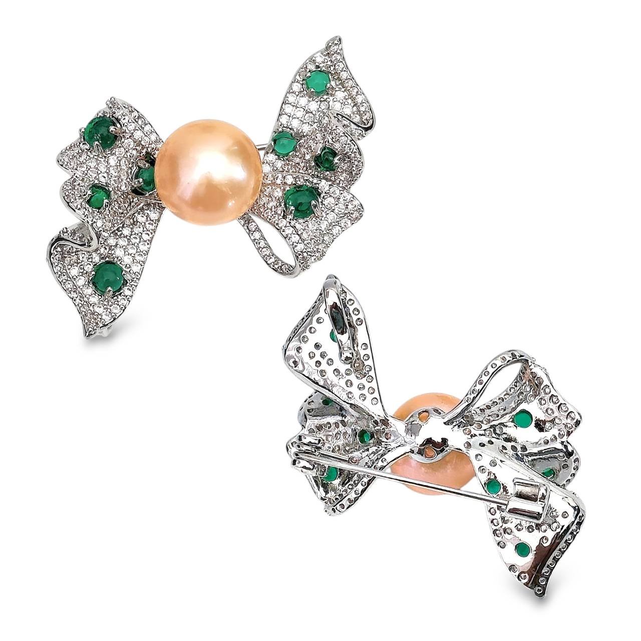 Approx. 12.0 mm, Edison Pearl, Bow Poka dot Green CZ Pearl Alloy Brooch
