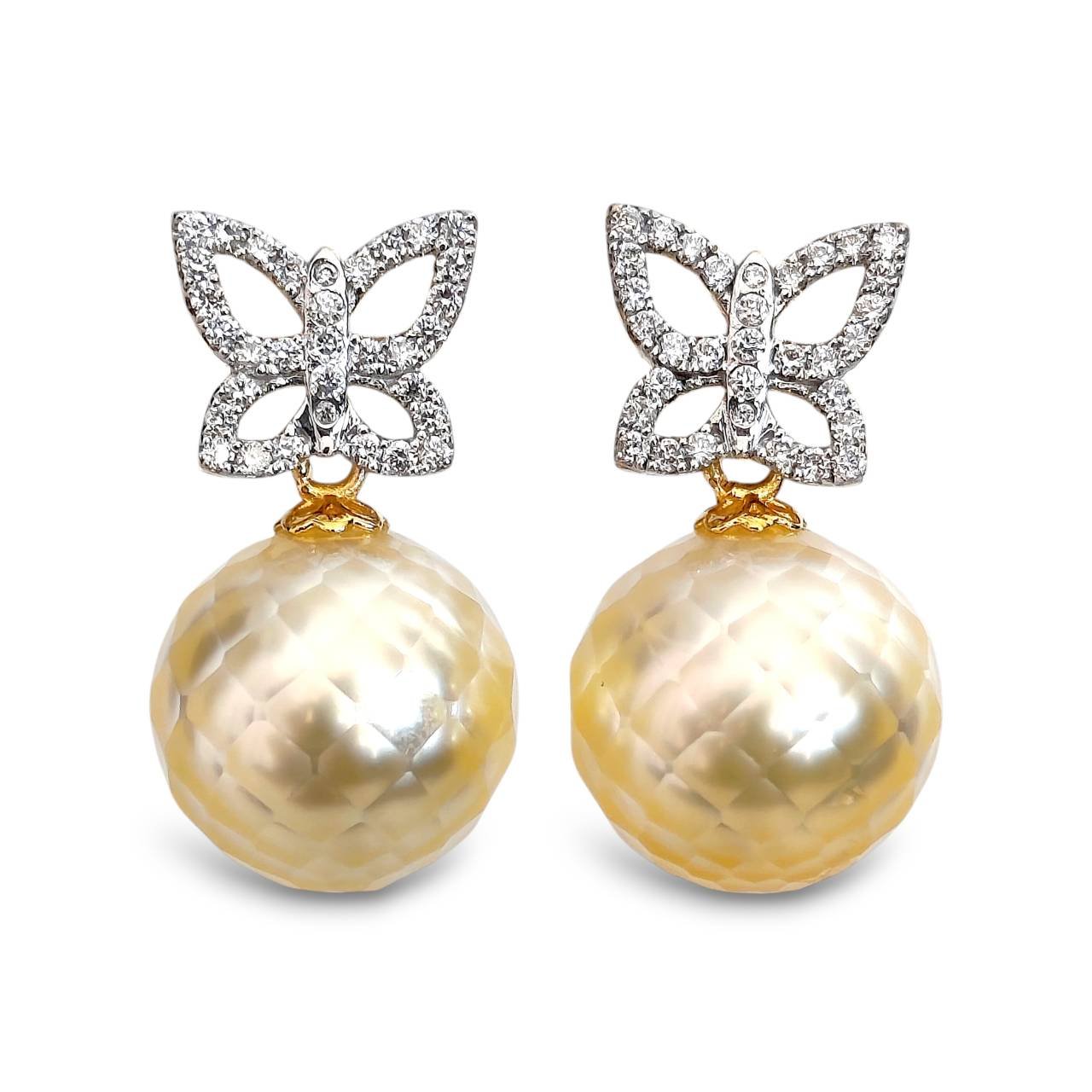 11.9 mm and 12.2 mm, Hanashinju Pearl, Gold South Sea Pearl, Stencil Butterfly Diamond Paved Dangle Pearl Stud Earrings