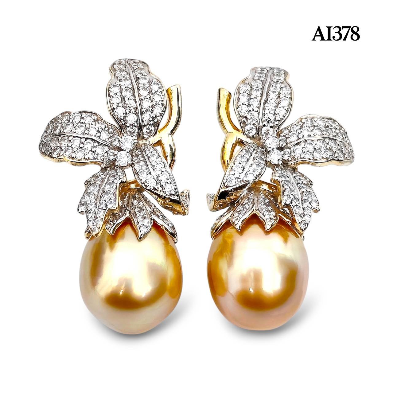 Approx. 13.0 - 14.0 mm, Gold South Sea Pearl, Lily CZ Paved Pearl Stud Earrings