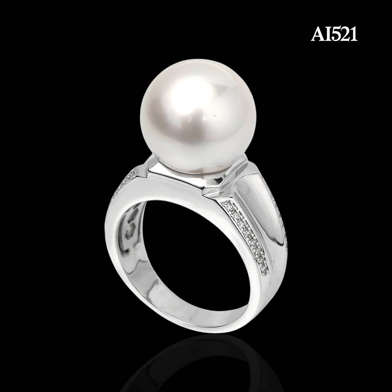 14.7 mm, White South Sea Pearl, Solitair Pearl Men Ring Shoulder Edge Diamond Paved
