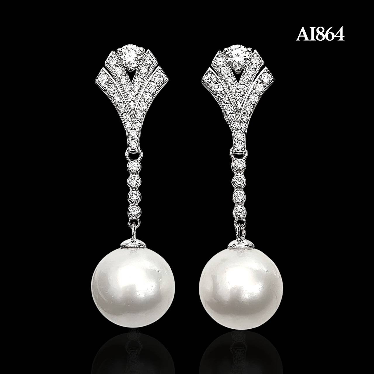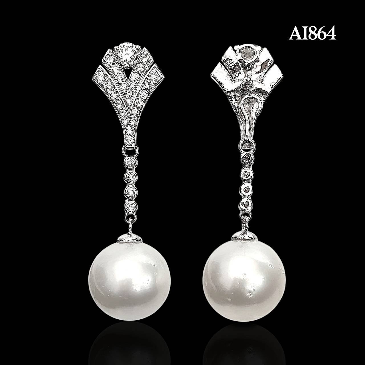 12.8 mm and 12.9 mm, White South Sea Pearl, "Cabaret" Diamond Row Dangle Pearl Stud Earrings