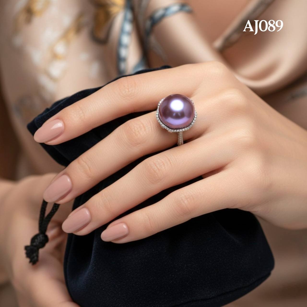 14.3 mm, Edison Pearl, Solitaire Pearl Stencil Cup Moissanite Paved Ring