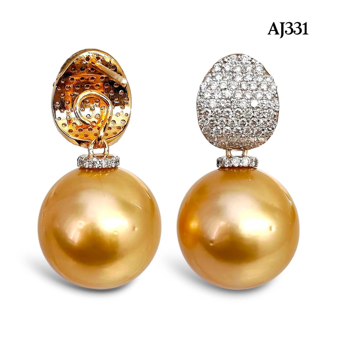 Approx. 13.0 mm, Gold South Sea Pearl, Diamond Leaf Dangle Pearl Stud Earrings