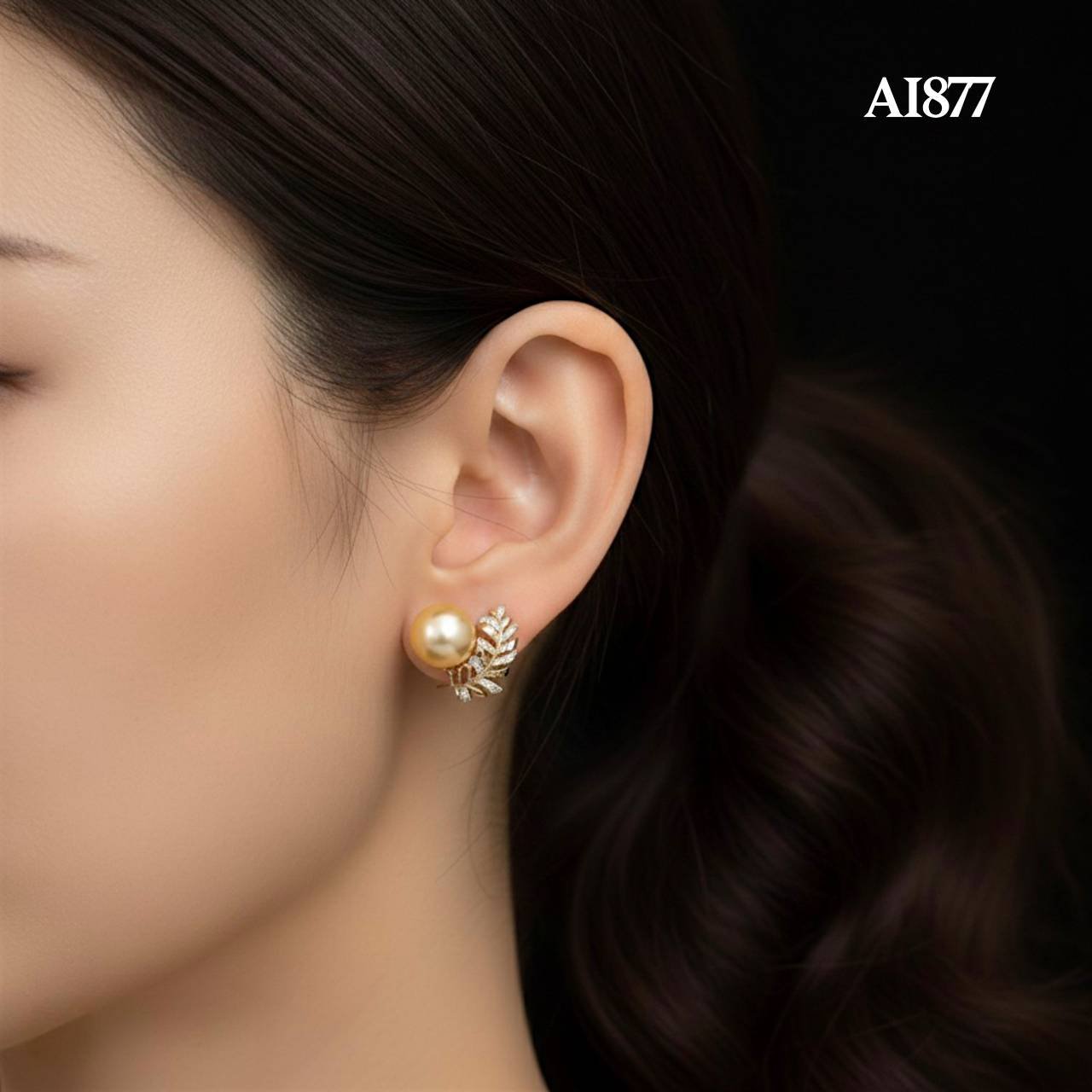 10.5 mm and 10.6 mm, Gold South Sea Pearl, Plume Diamond Paved Pearl Stud Earrings